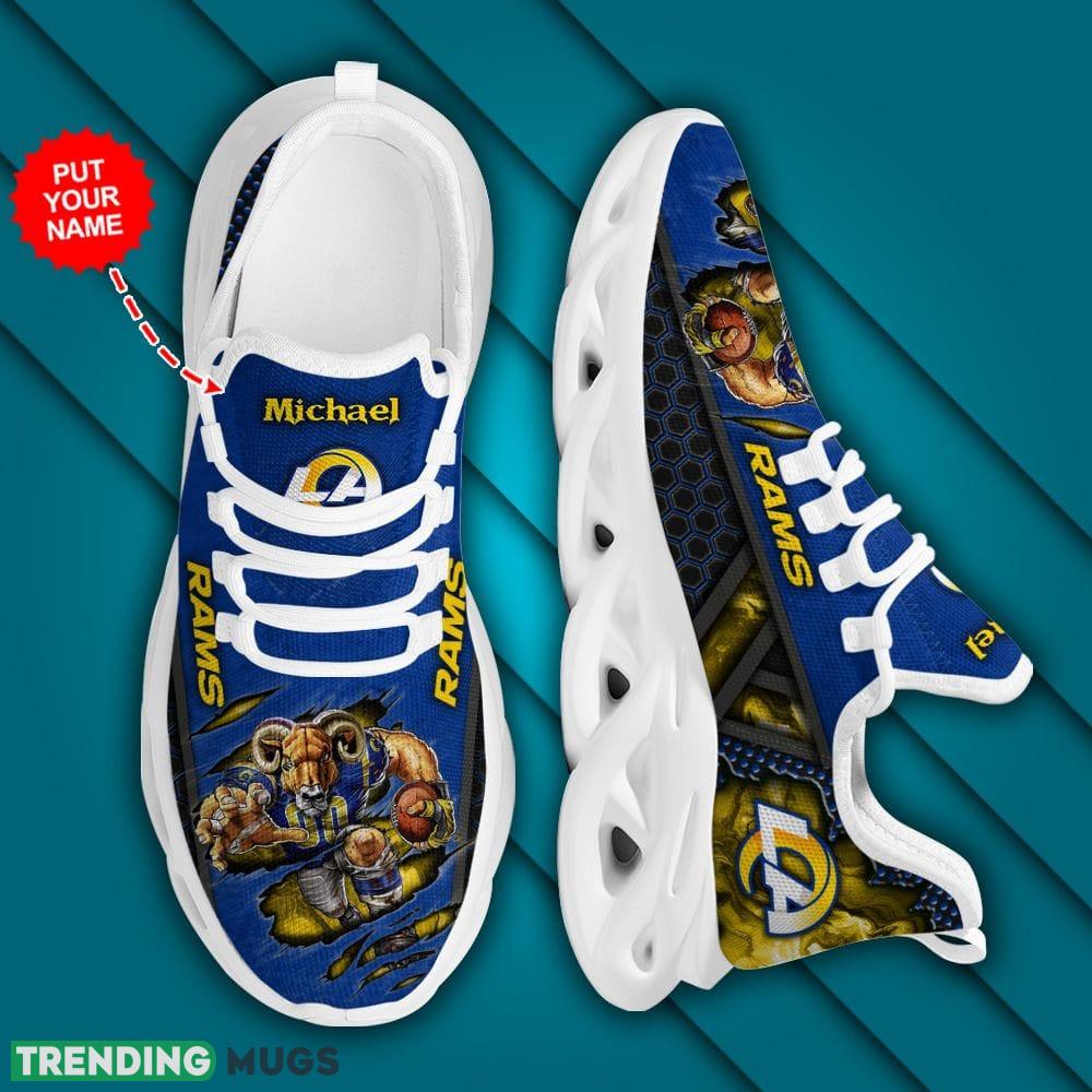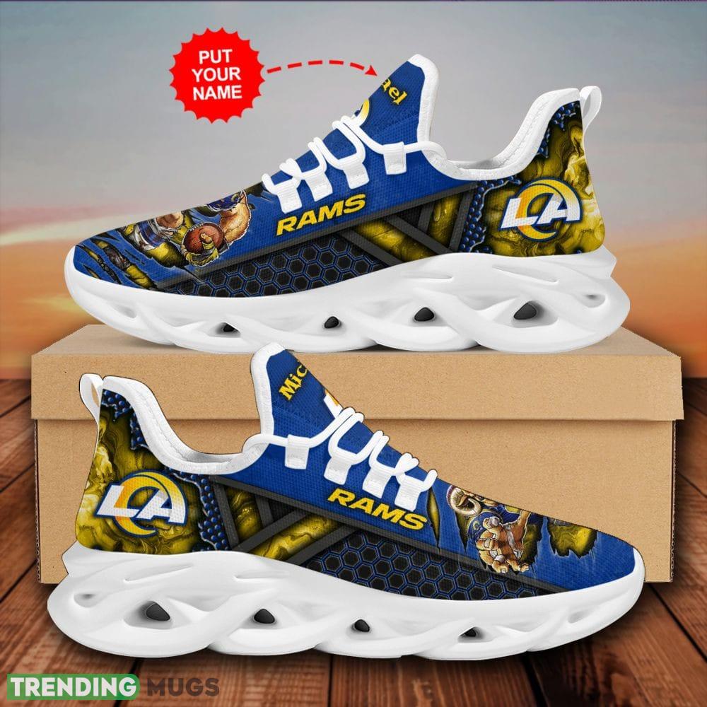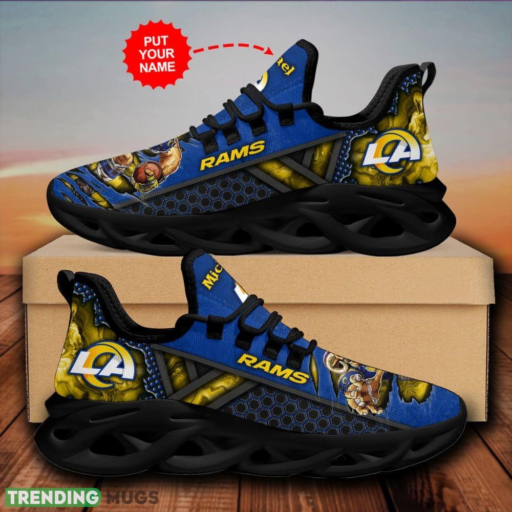 Don’t settle for ordinary footwear – step into the spotlight with our Los Angeles Rams Modern Custom Name Max Soul Shoes Luxury NFL Clunky. Order your pair today and take your Rams pride to the next level!