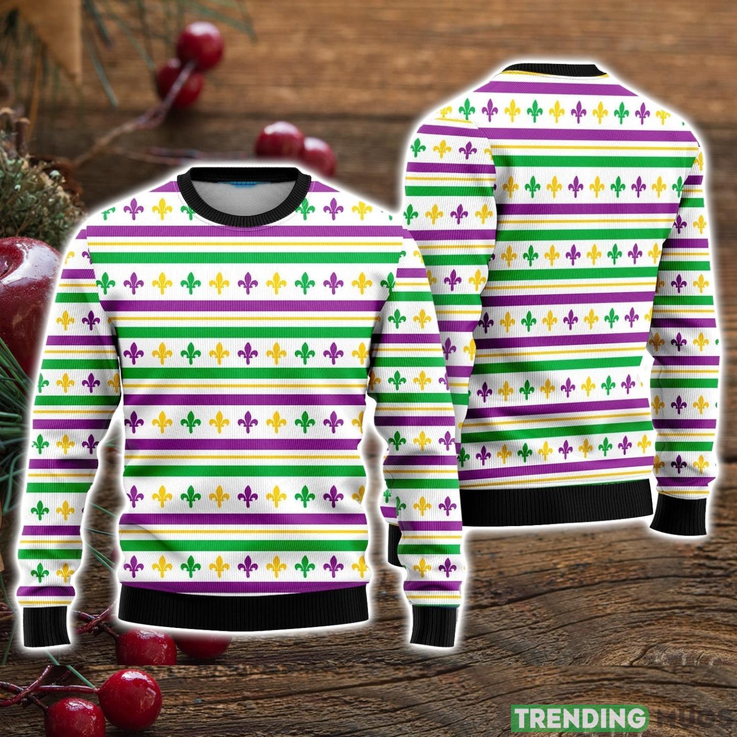 Whether you’re attending an ugly sweater party or just want to spread some holiday cheer, this sweater is sure to turn heads. Its bold stripes in Mardi Gras colors make it an instant conversation starter, while the classic Christmas patterns add a touch of tradition.