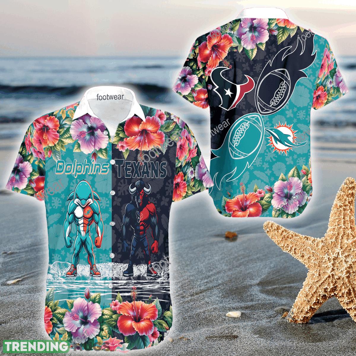 Mascot Miami Dolphins VS Houston Texans 3D Hawaiian Shirt Hibiscus For Men Women – Mascot Miami Dolphins VS Houston Texans 3D Hawaiian Shirt Hibiscus For Men Women