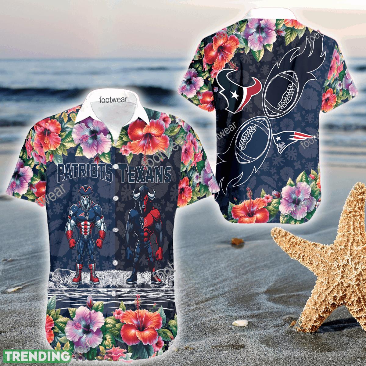 Mascot New England Patriots VS Houston Texans 3D Hawaiian Shirt Hibiscus For Men Women – Mascot New England Patriots VS Houston Texans 3D Hawaiian Shirt Hibiscus For Men Women