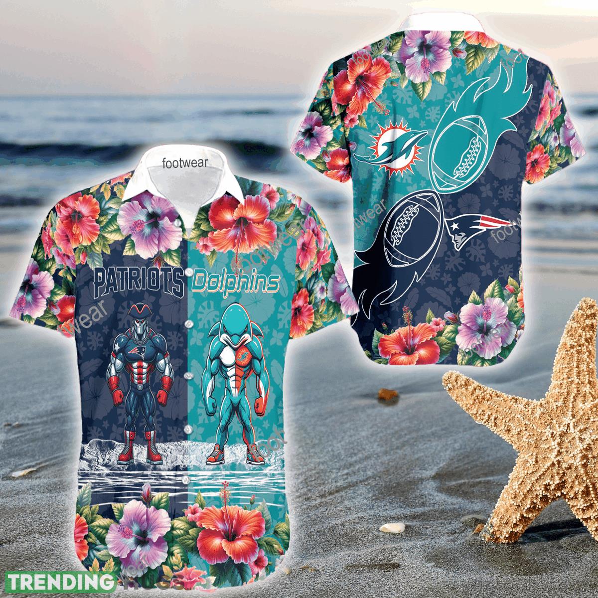 Mascot New England Patriots VS Miami Dolphins 3D Hawaiian Shirt Hibiscus For Men Women Details: