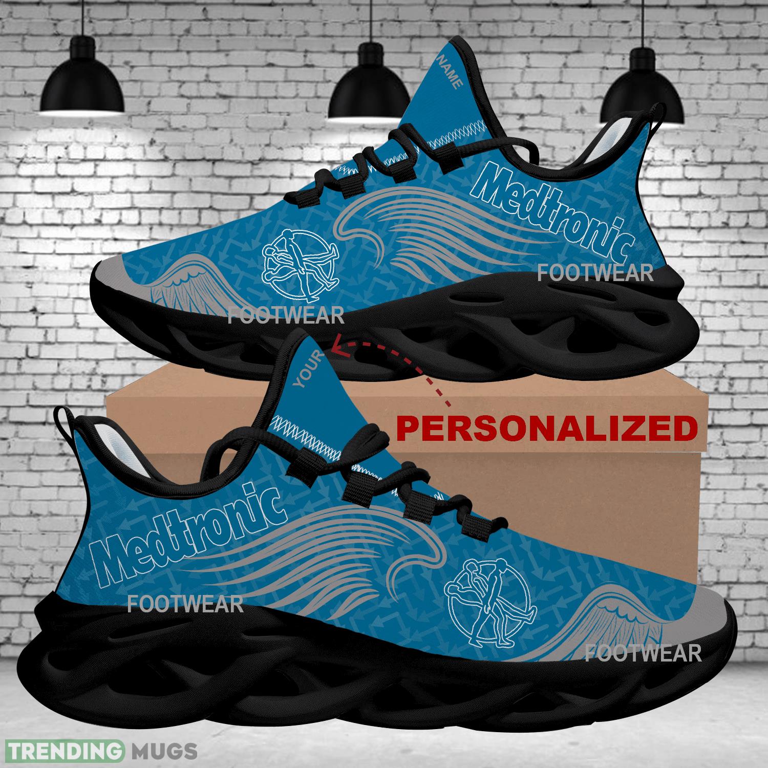 This Medtronic Hula Brand Logo Wings Pattern Max Soul Shoes Personalized Symbol Chunky Sneaker is a breathable, lightweight, and comfortable casual outdoor shoe that has a unique design. It is made of a mesh fabric which makes it sweat absorbent and breathable, while the rubber bottom ensures traction, comfort, and durability. It is available in two colors: black or white sole. There are two styles of shoelace holes so you can choose your preference.