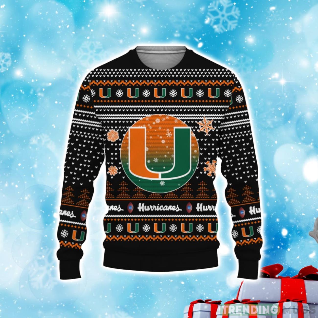 Crafted with the highest attention to detail, this sweater features the iconic Miami Hurricanes logo proudly displayed on the front. The vibrant green and orange colors will make you stand out from the crowd, while the football American design adds a unique touch to this Christmas sweater.
