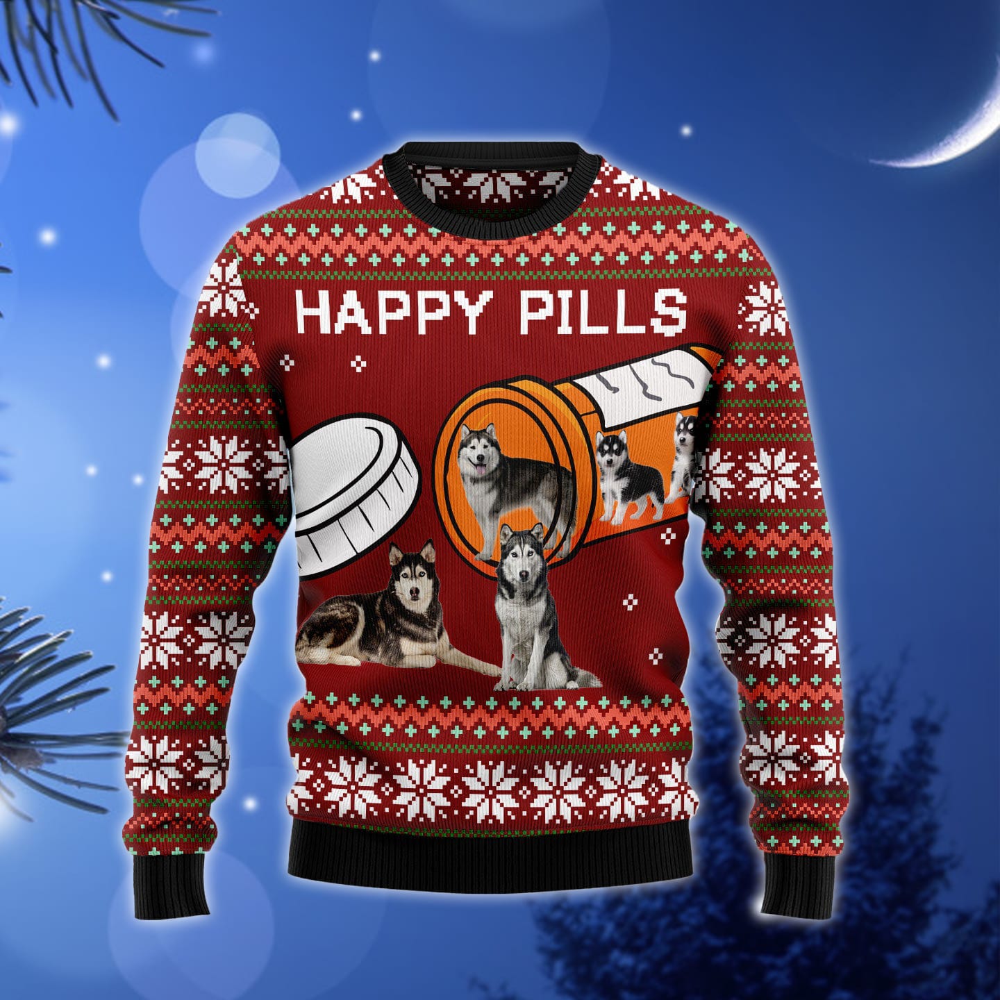 Spread the holiday spirit with our Merry Siberian Husky Happy Pills Ugly Christmas Sweater Gift for men and women. Order yours today and make this Christmas a truly unforgettable one!
