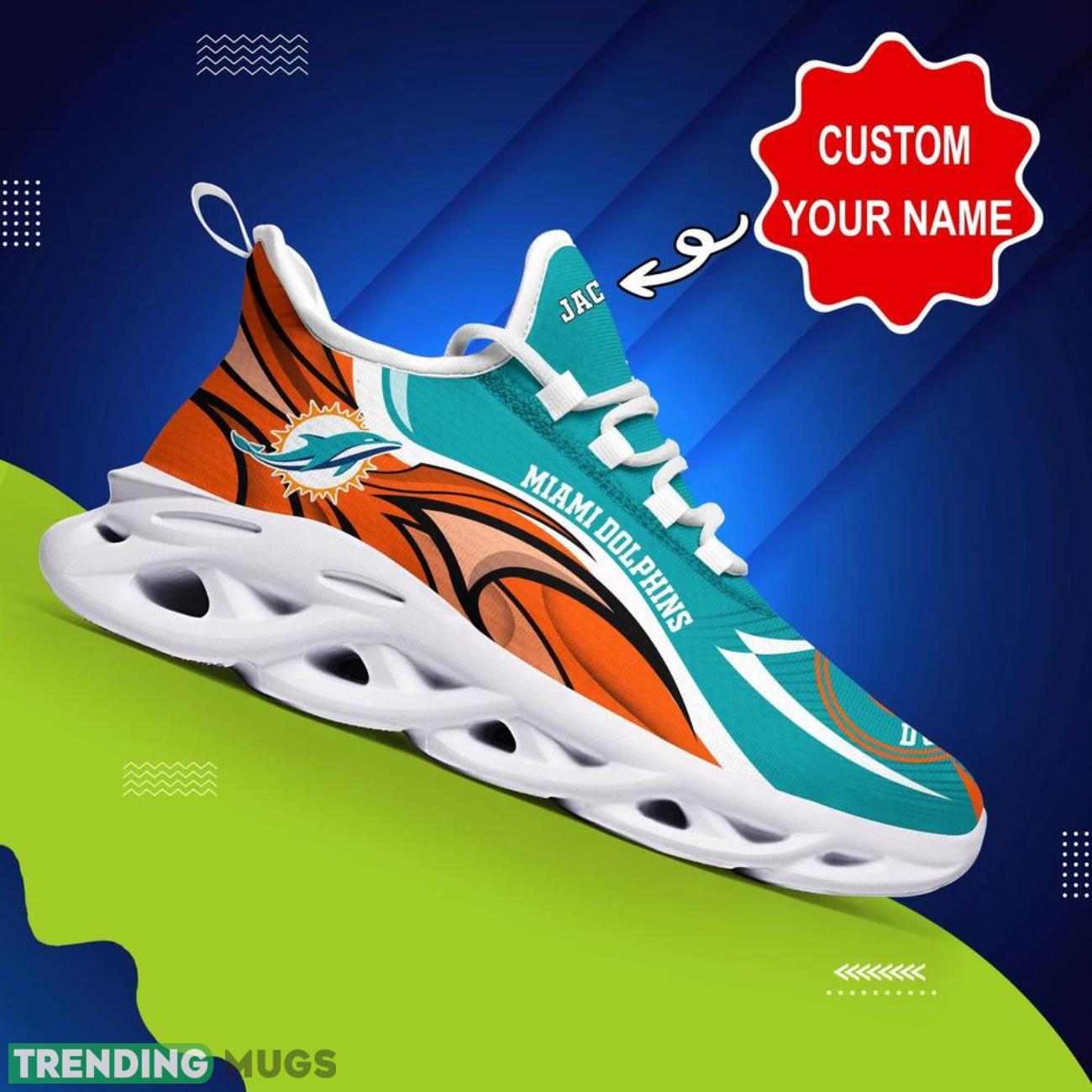 This Miami Dolphins NFL Logo Sport Team Max Soul Shoes Custom Name Sneakers Hot Trending Personalized Gifts is a breathable, lightweight, and comfortable casual outdoor shoe that has a unique design. It is made of a mesh fabric which makes it sweat absorbent and breathable, while the rubber bottom ensures traction, comfort, and durability. It is available in two colors: black or white sole. There are two styles of shoelace holes so you can choose your preference.