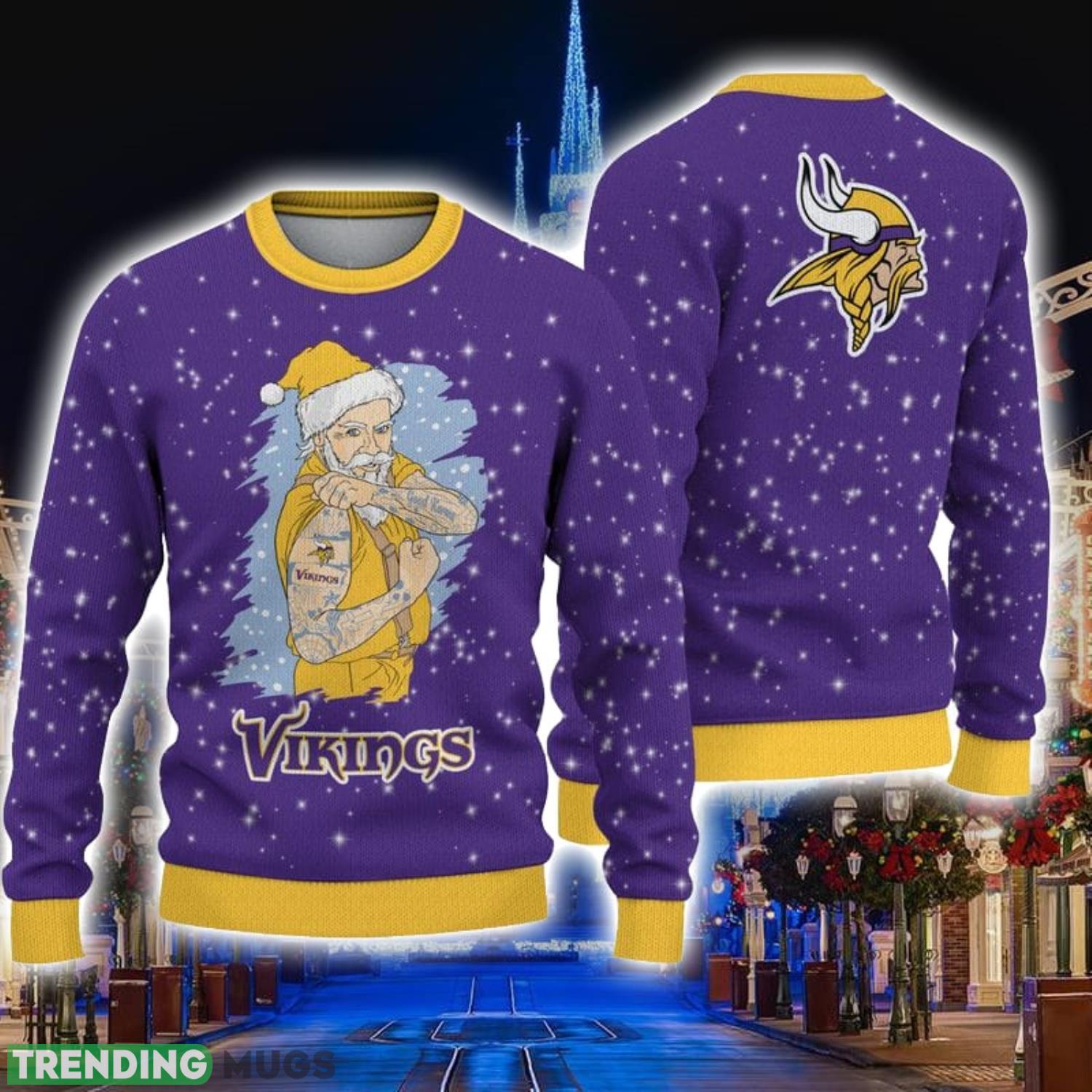 Featuring a jolly Santa Claus rocking a Minnesota Vikings tattoo, this sweater combines the festive spirit of Christmas with your unwavering team pride. The vibrant colors and eye-catching design are guaranteed to turn heads at any holiday gathering or game day celebration. Whether you’re attending a holiday party or cheering on your favorite team, this sweater is sure to make a statement.