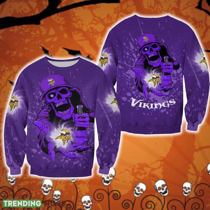 Featuring the iconic Minnesota Vikings logo intricately integrated with hauntingly cool skull motifs, this sweater effortlessly blends team pride with a touch of eerie charm. Crafted with utmost attention to detail, the high-quality fabric ensures optimum comfort and durability, making it ideal for both Halloween parties and cozy nights by the fire.