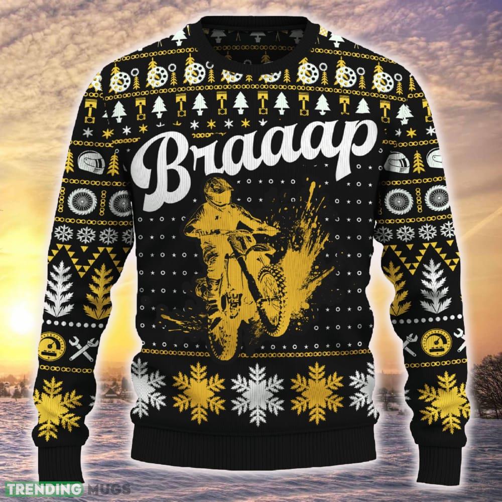 Crafted with utmost attention to detail, this sweater showcases a vibrant motocross design, featuring the iconic Braaap KX100 motorcycle. The intricate 3D Christmas tree motif adds an extra touch of holiday magic, making this sweater a true standout in any crowd.