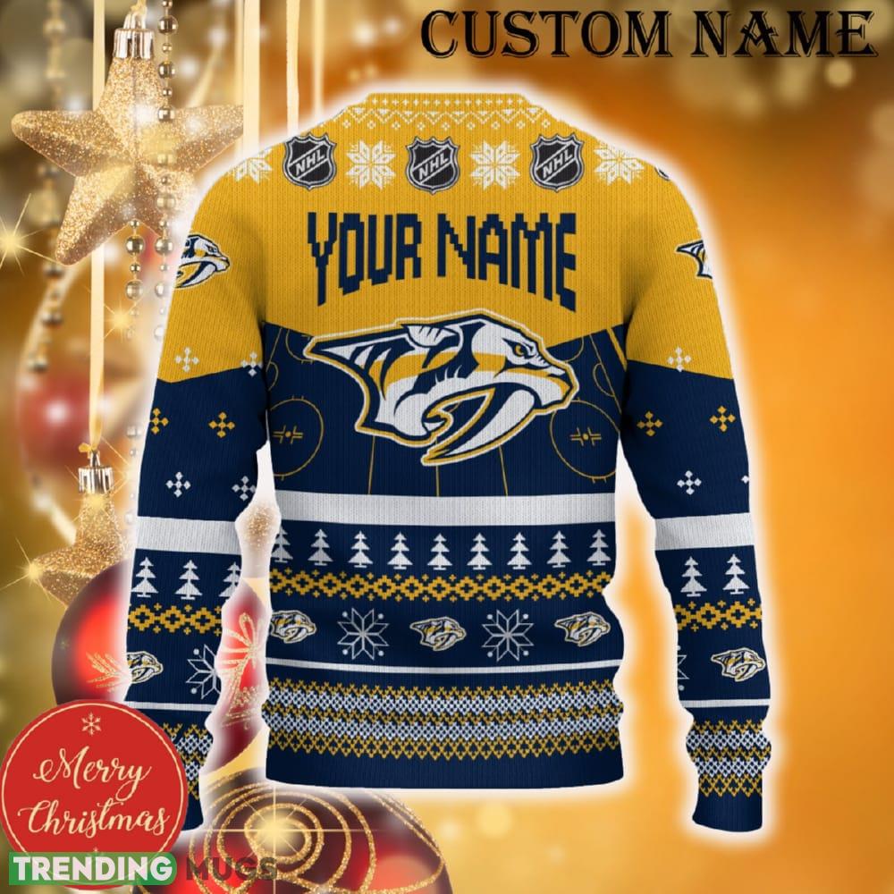 Designed with a touch of humor, this custom name gift will surely make heads turn at any Christmas party. The angry Nashville Predators logo adds a unique twist to the classic ugly Christmas sweater, making it a standout piece in your festive wardrobe.