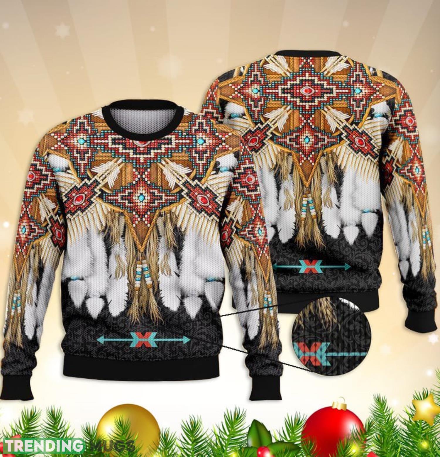 Crafted with utmost attention to detail, our sweater features a full print design that brings the vibrant colors and intricate patterns to life. Made from high-quality materials, it ensures both comfort and durability, keeping you cozy throughout the festive season. The black background perfectly enhances the boldness of the Native American pattern, creating a striking contrast that will turn heads wherever you go.
