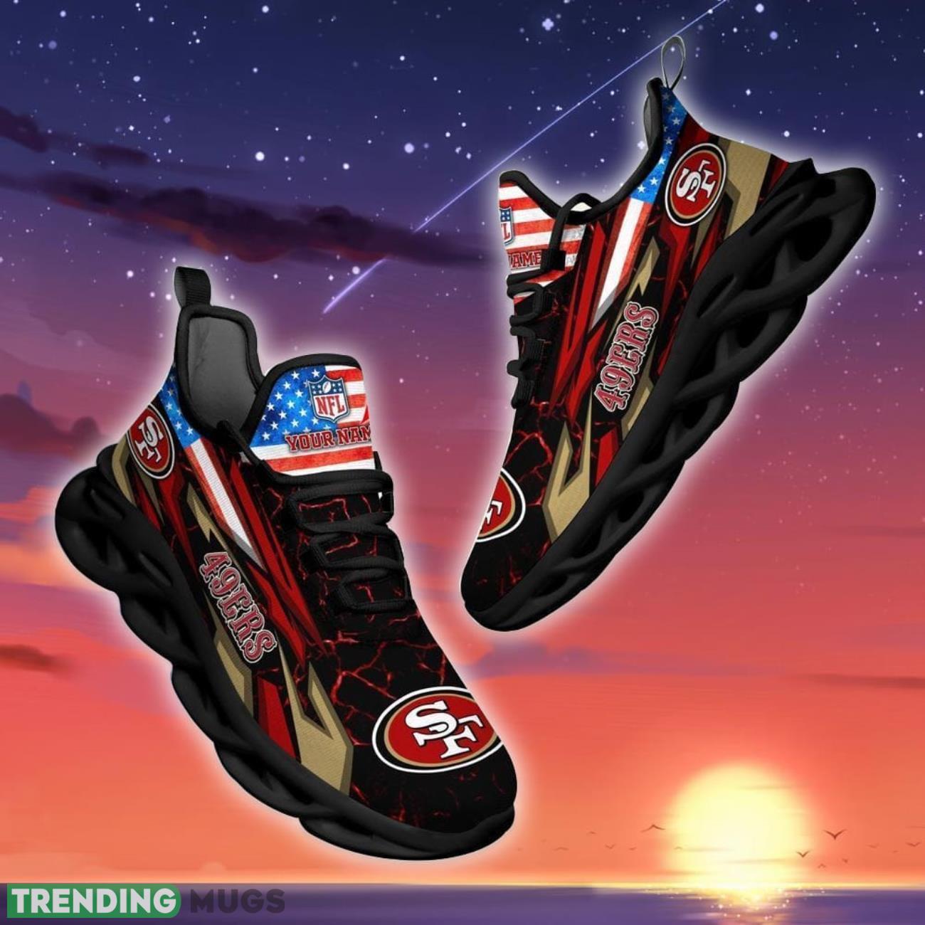 Elevate your game day style with the NCAA San Francisco 49ers Logo And Flag Custom Name Max Soul Shoes! Perfect for any die-hard 49ers fan, these custom shoes feature the iconic team logo and flag design, making them a must-have accessory for showing off your team pride. Personalize them with your name to make them truly one-of-a-kind. Whether you’re cheering from the stands or watching from home, these shoes are sure to make a statement. Treat yourself or surprise a fellow fan with the ultimate gift. Step up your fan gear with these exclusive Max Soul Shoes!