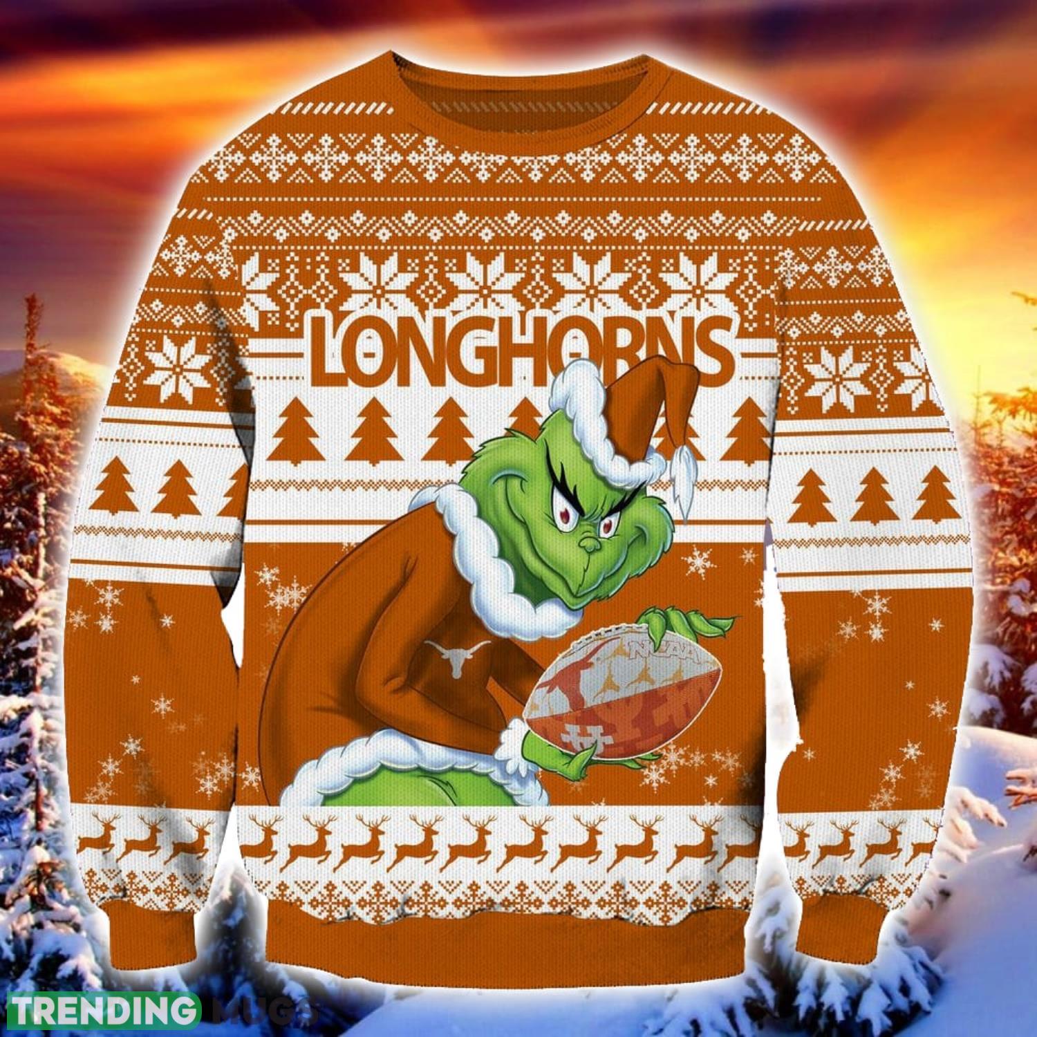 NCAA Texas Longhorns Logo Grinch Ugly Christmas Sweater Trending Sweater For 2023 Christmas Holidays Product Photo 1