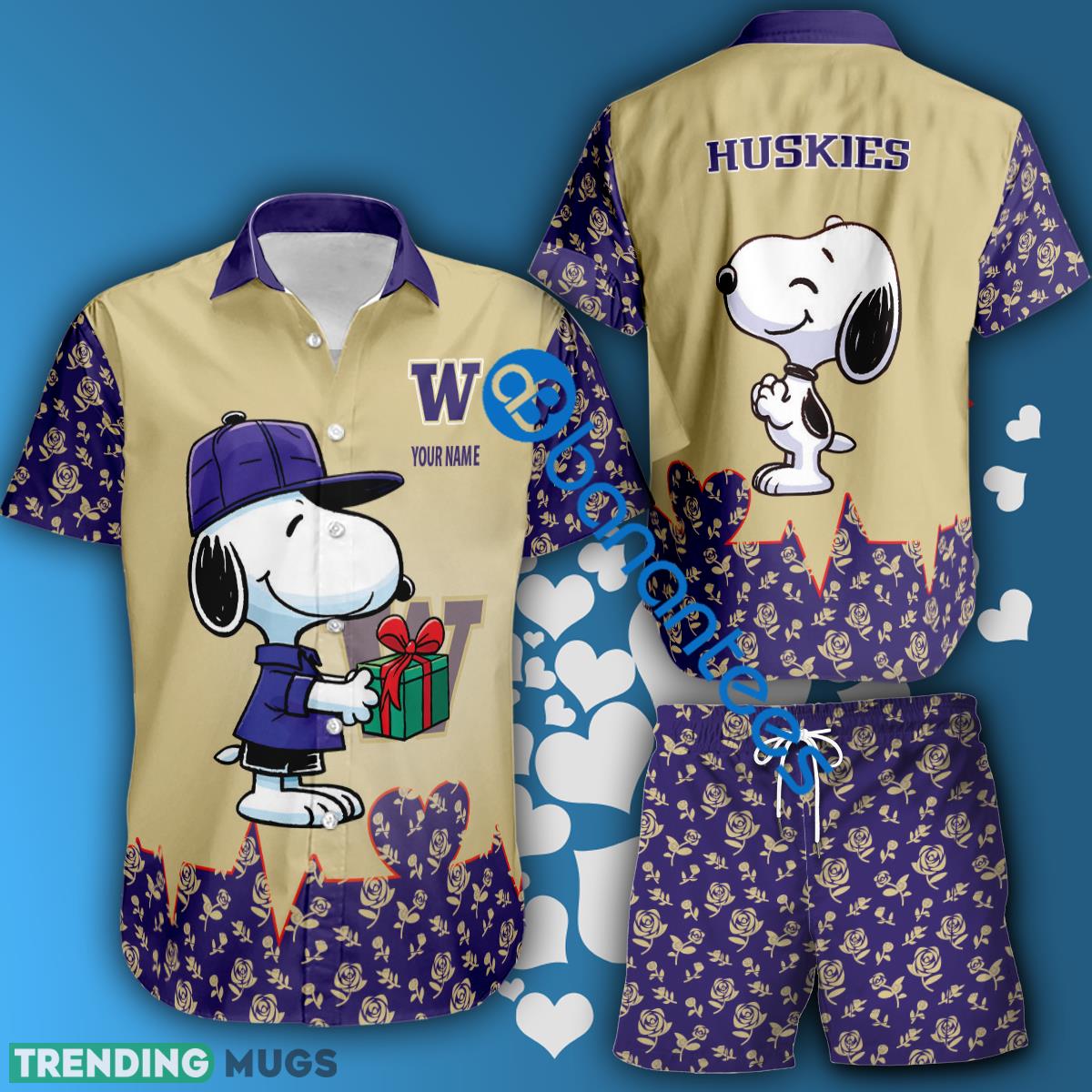 NCAA Washington Huskies Snoopy Gift Boyfriend And Girlfriend Hawaiian Shirt And Short Set Custom Name Details: