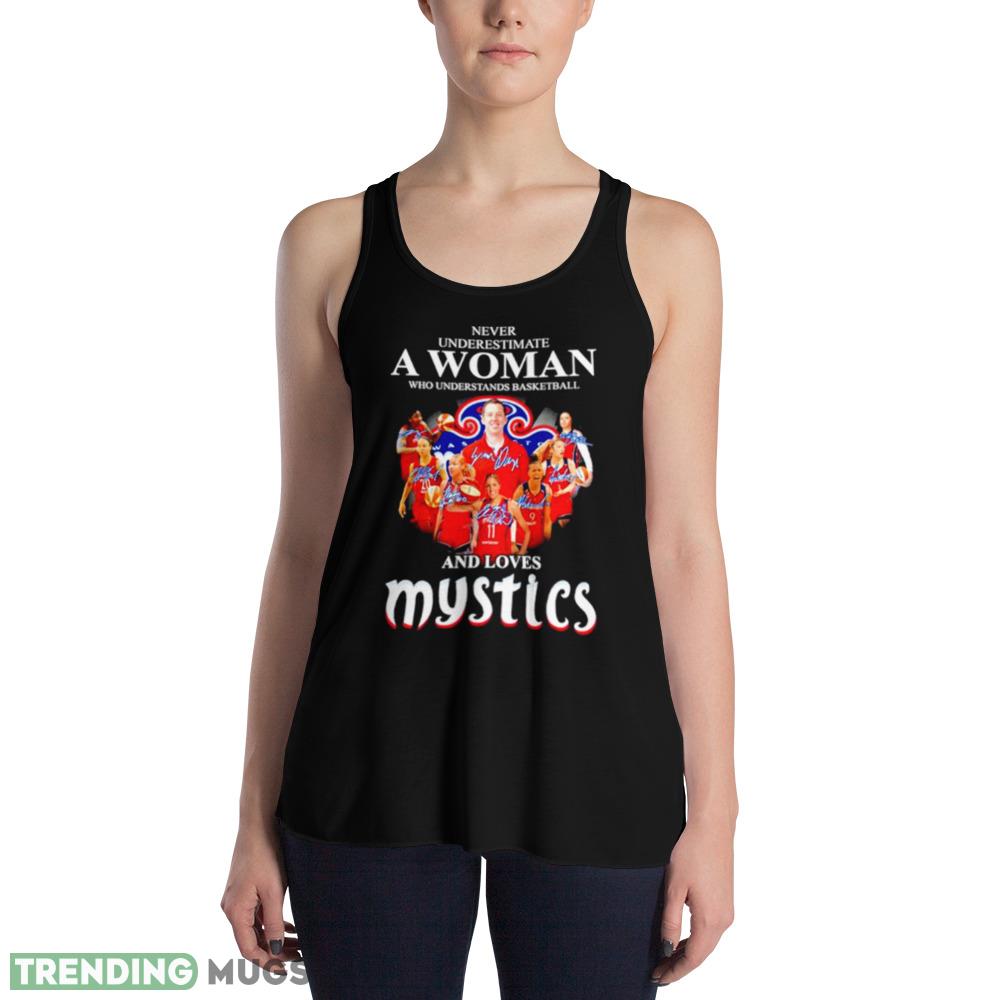 The front of the shirt features a bold and powerful message that reads “Never underestimate a woman who understands basketball and loves Mystics signatures”. This message is a powerful statement that shows your dedication to the game and your unwavering support for your favorite team. It also celebrates the strength and resilience of women who love basketball, and it is sure to inspire and motivate you every time you wear it.