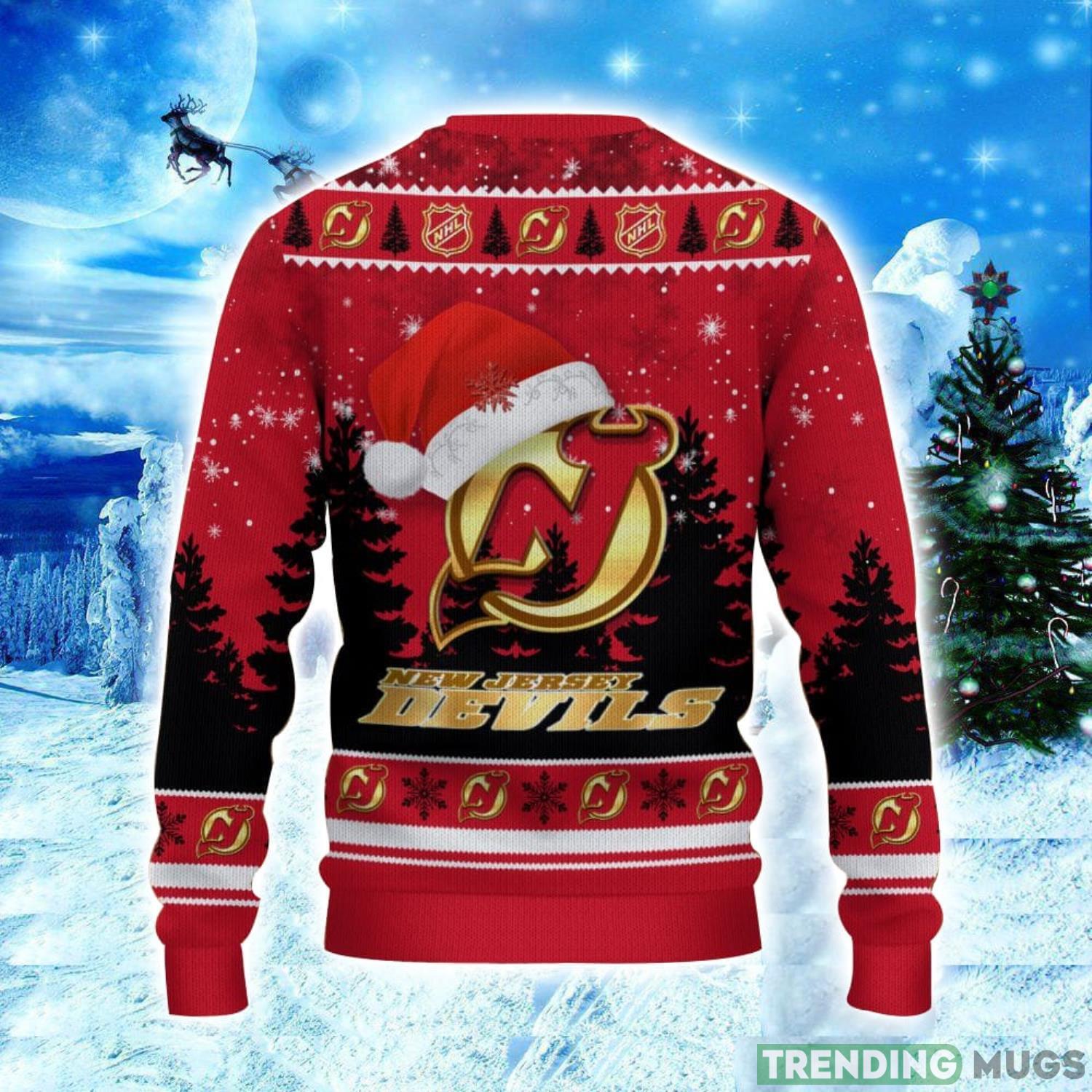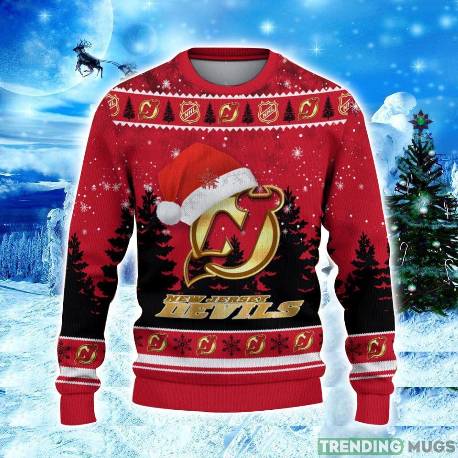 Whether you’re attending an ugly sweater party, cheering on the Devils during the winter season, or simply want to showcase your love for the team and the holidays, our New Jersey Devils Logo Wearing Santa Hat Christmas Gift Ugly Christmas Sweater is the ideal choice. Get yours today and make a stylish statement this Christmas!