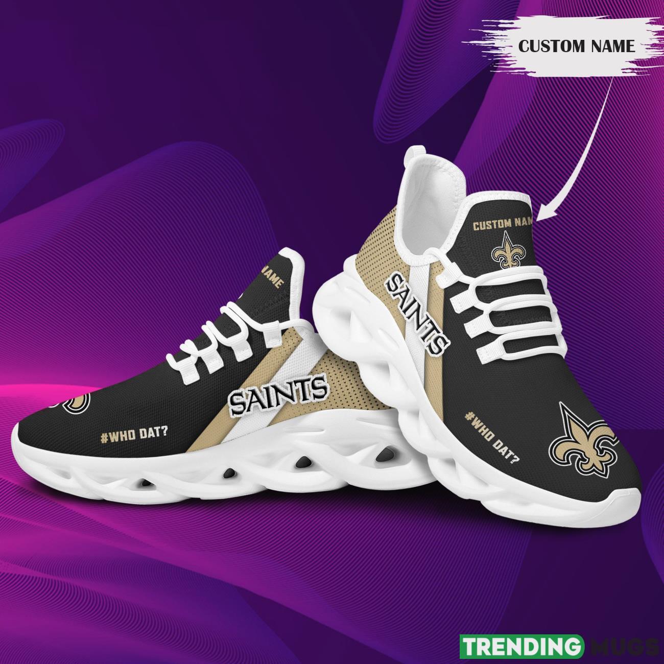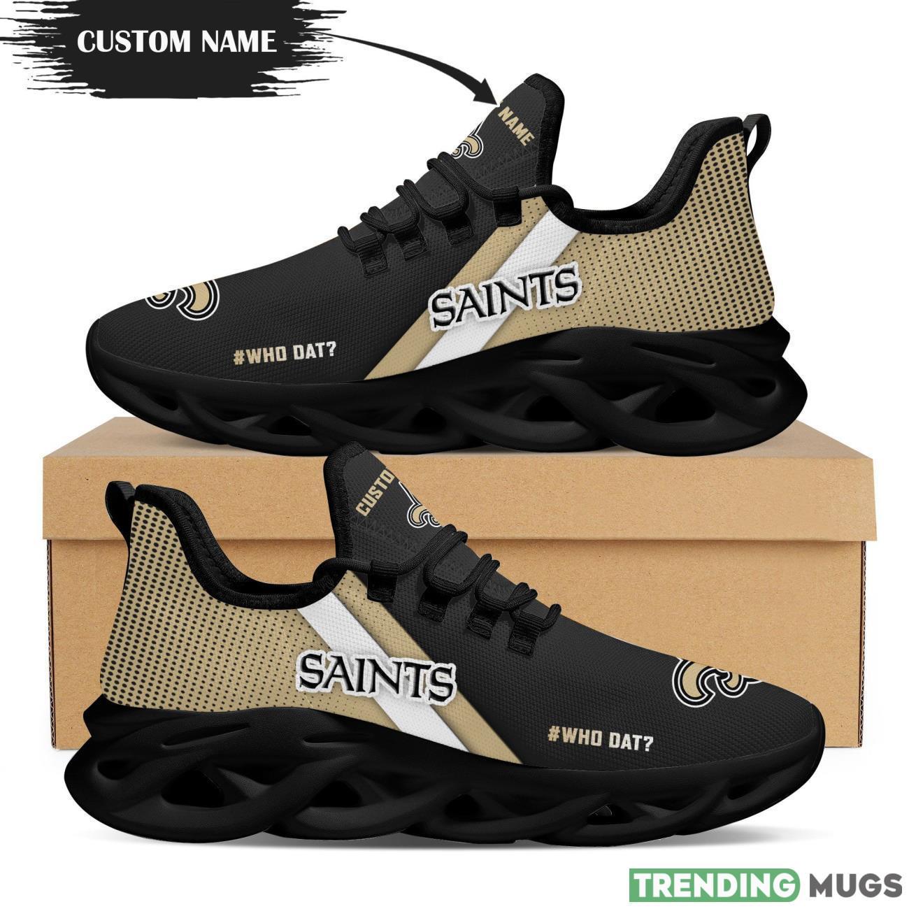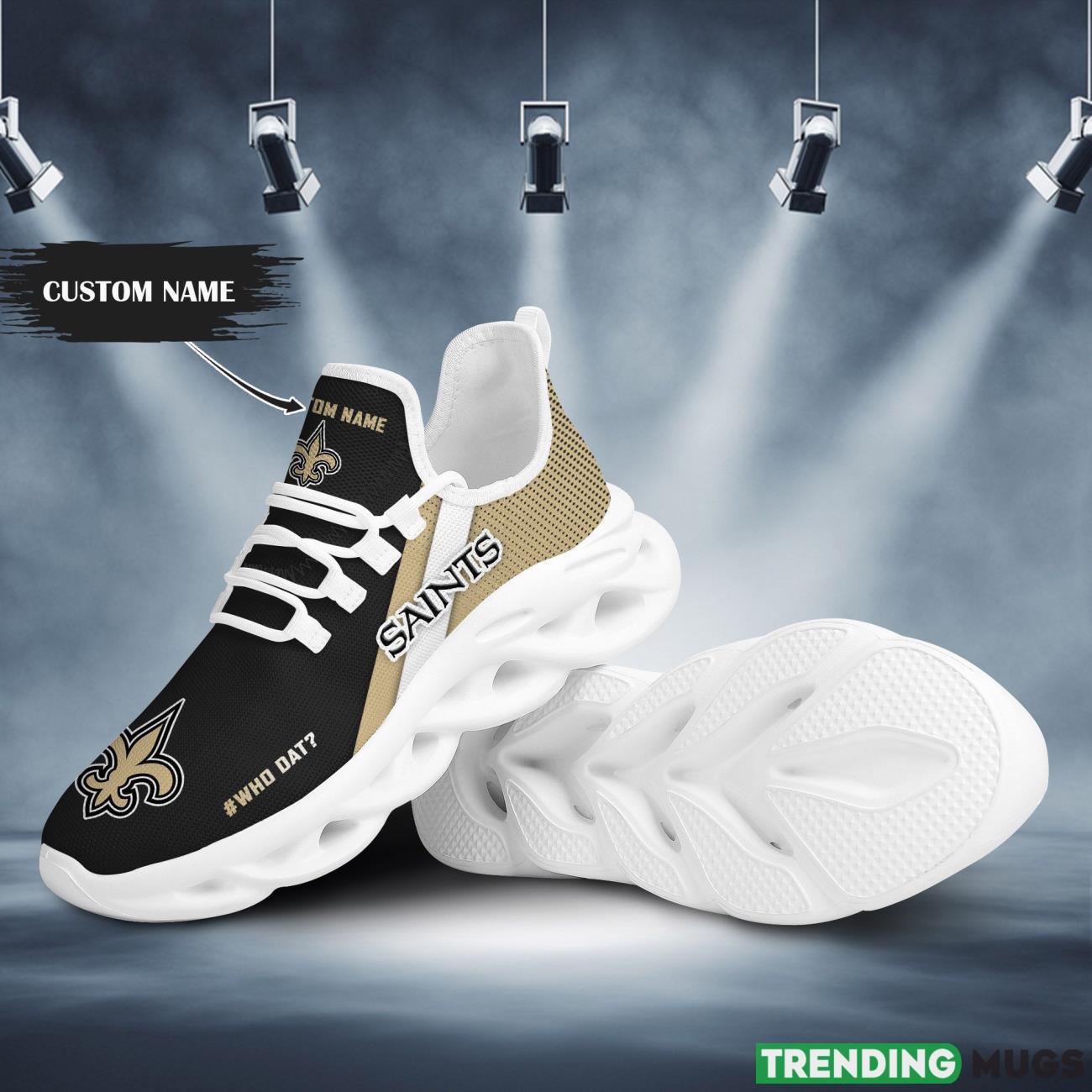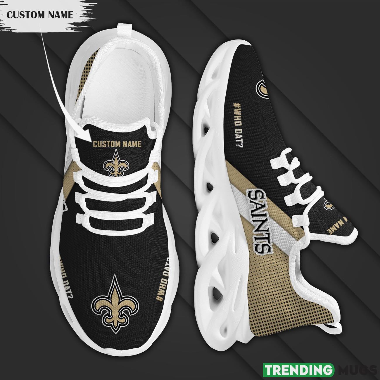 This New Orleans Saints Custom Personalized Max Soul Sneakers Running Sports Shoes is a breathable, lightweight, and comfortable casual outdoor shoe that has a unique design. It is made of a mesh fabric which makes it sweat absorbent and breathable, while the rubber bottom ensures traction, comfort, and durability. It is available in two colors: black or white sole. There are two styles of shoelace holes so you can choose your preference.
