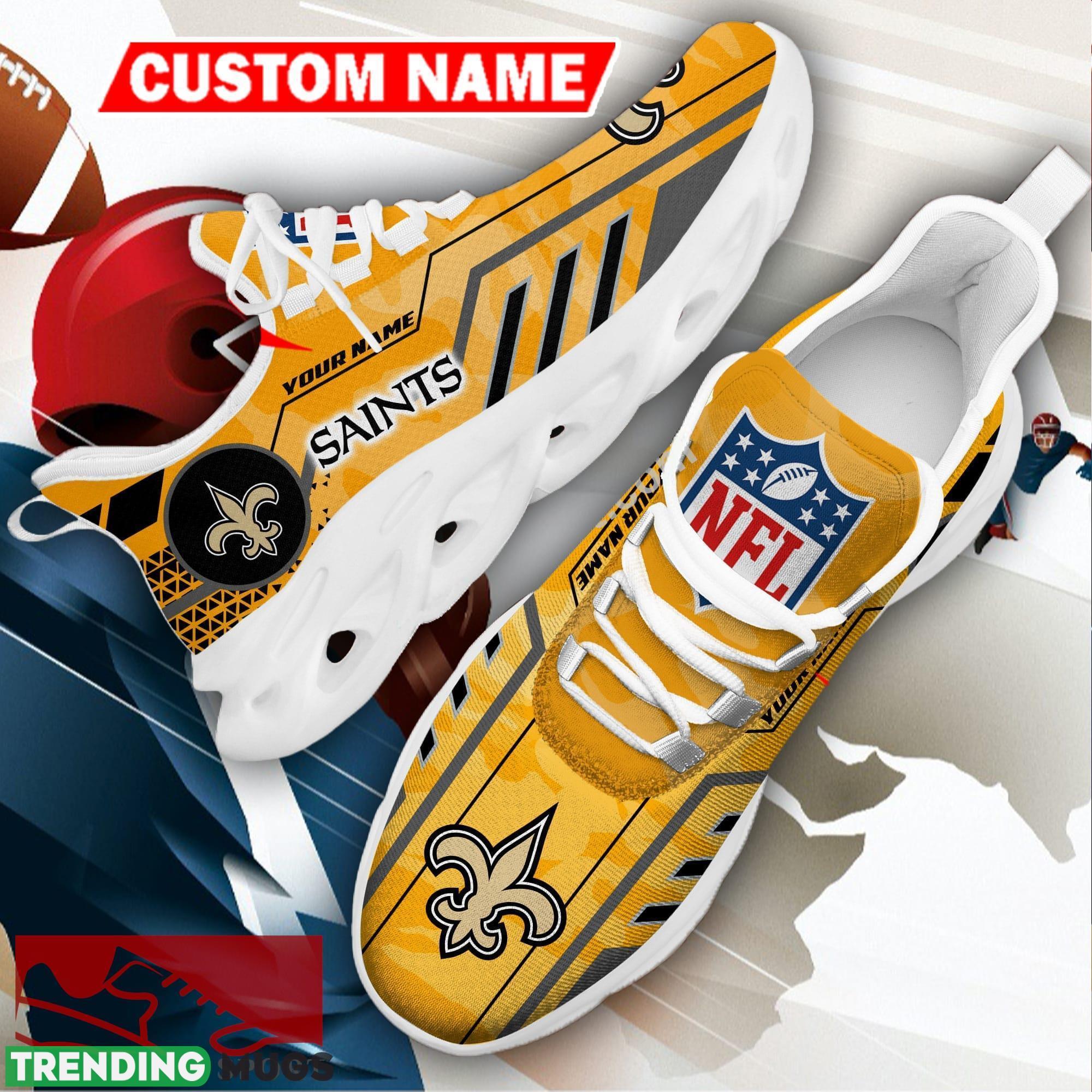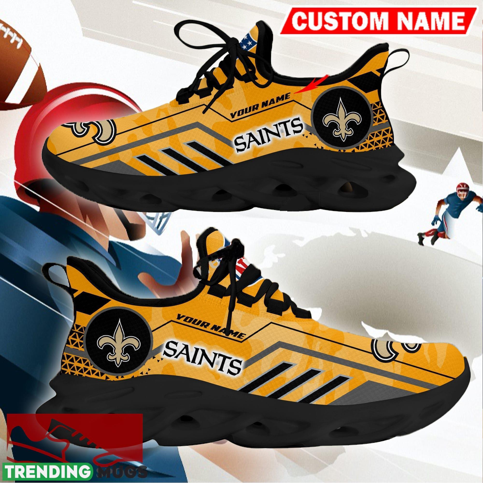 This New Orleans Saints NFL Logo Chunky Sneakers Camo Yellow Max Soul Shoes Personalized is a breathable, lightweight, and comfortable casual outdoor shoe that has a unique design. It is made of a mesh fabric which makes it sweat absorbent and breathable, while the rubber bottom ensures traction, comfort, and durability. It is available in two colors: black or white sole. There are two styles of shoelace holes so you can choose your preference.