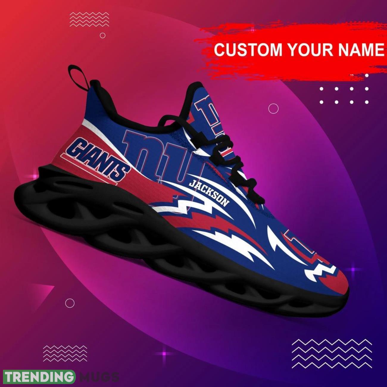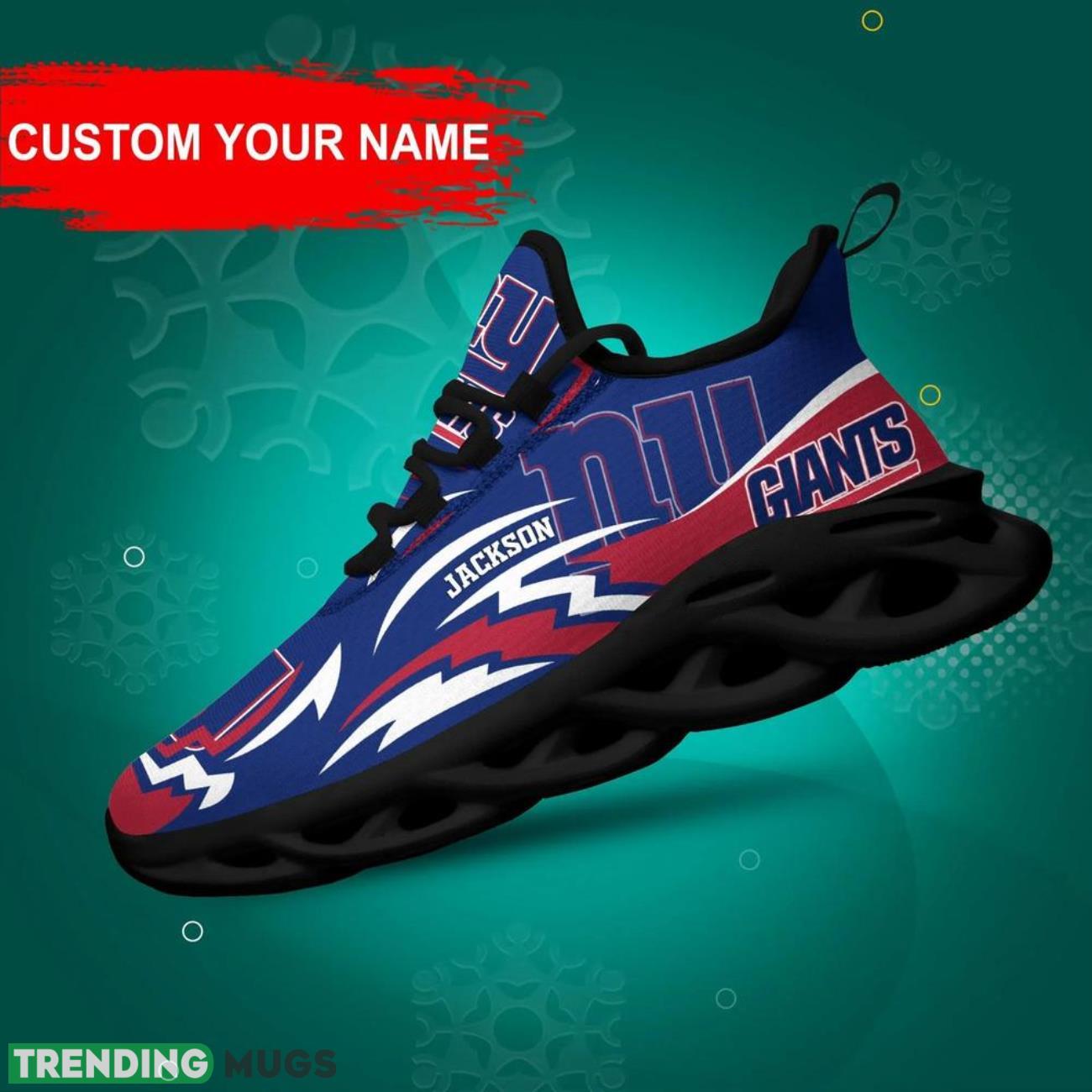 This New York Giants NFL Logo Sport Team Max Soul Shoes Custom Name Personalized Name Gifts Big Fans Sport Shoes is a breathable, lightweight, and comfortable casual outdoor shoe that has a unique design. It is made of a mesh fabric which makes it sweat absorbent and breathable, while the rubber bottom ensures traction, comfort, and durability. It is available in two colors: black or white sole. There are two styles of shoelace holes so you can choose your preference.