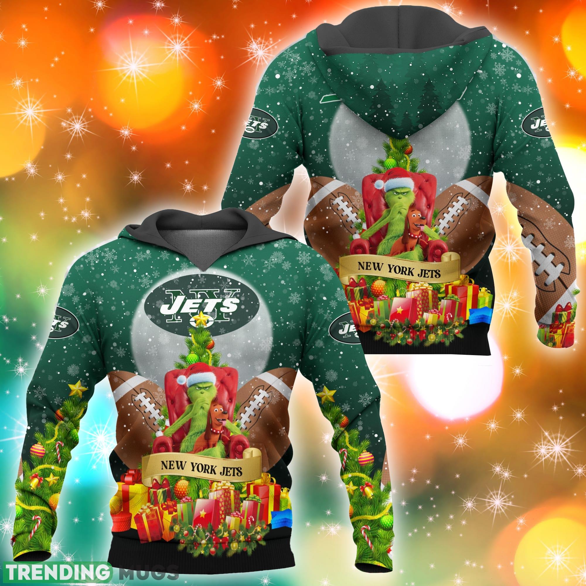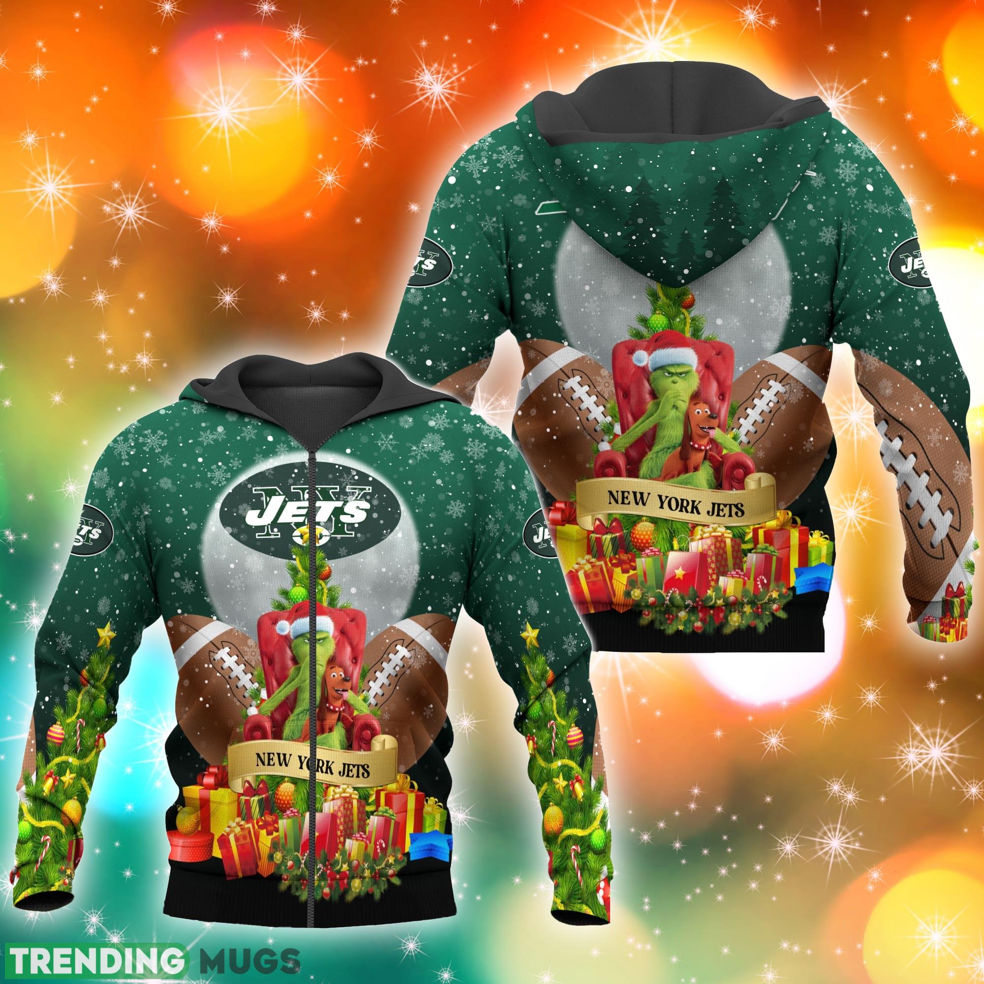 Featuring a stunning 3D design, this hoodie showcases a Grinch-inspired Christmas tree adorned with the iconic Jets logo and colors. The attention to detail is impeccable, making it a must-have for any die-hard Jets fan.