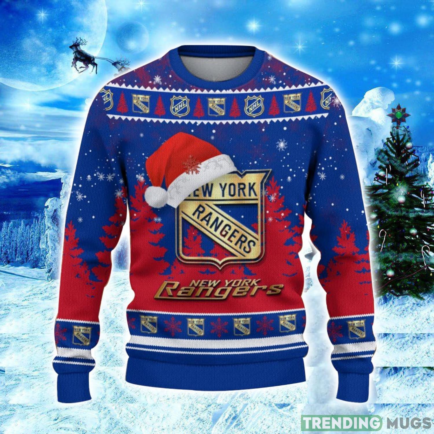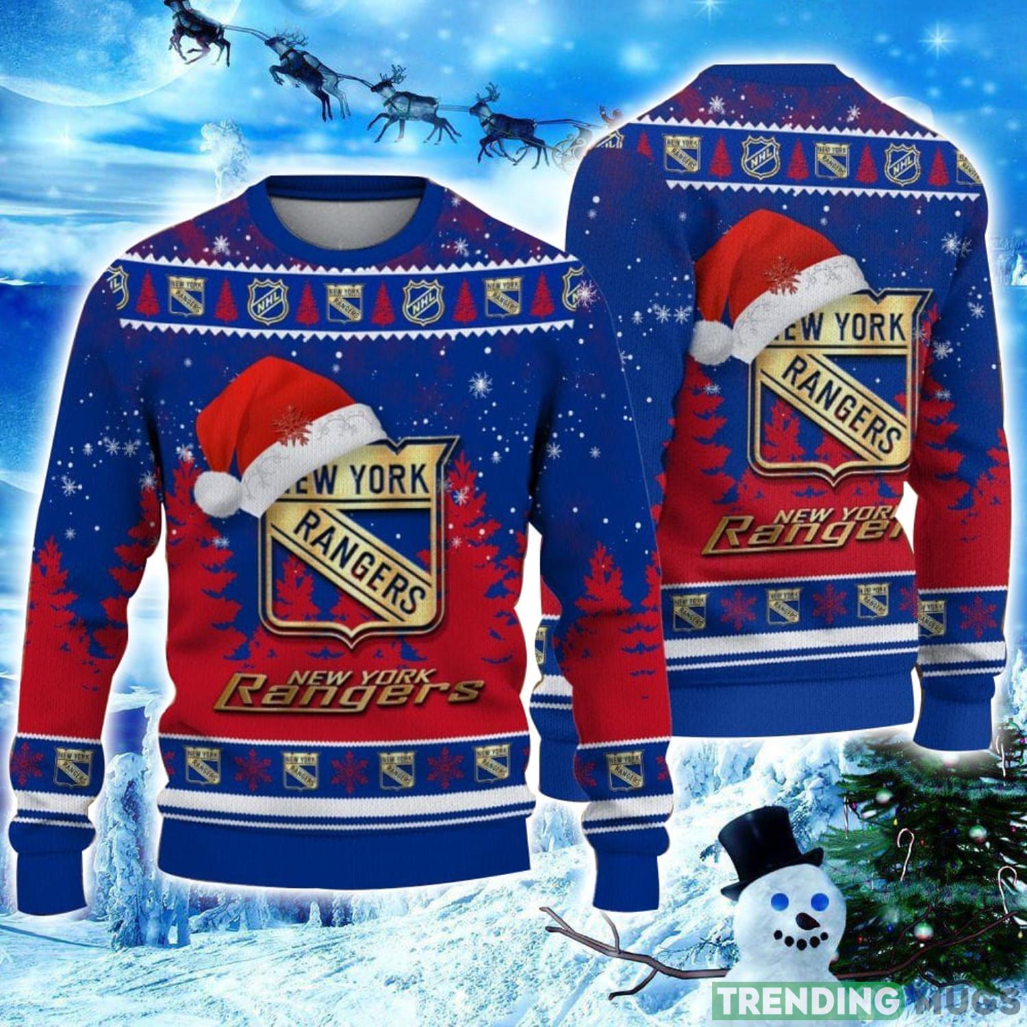 Featuring the iconic New York Rangers logo adorned with a jolly Santa hat, this sweater combines team spirit with holiday cheer in the most stylish way. The bold and vibrant colors will make you stand out at any Christmas party or family gathering, capturing everyone’s attention and sparking conversations.