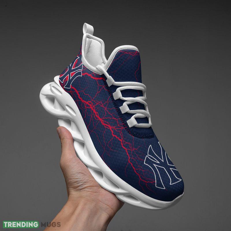 This New York Yankees Lightning Pattern Max Soul Shoes Footwear Sport Sneakers is a breathable, lightweight, and comfortable casual outdoor shoe that has a unique design. It is made of a mesh fabric which makes it sweat absorbent and breathable, while the rubber bottom ensures traction, comfort, and durability. It is available in two colors: black or white sole. There are two styles of shoelace holes so you can choose your preference.
