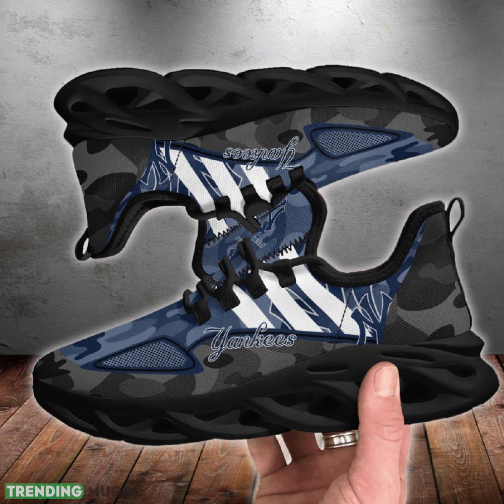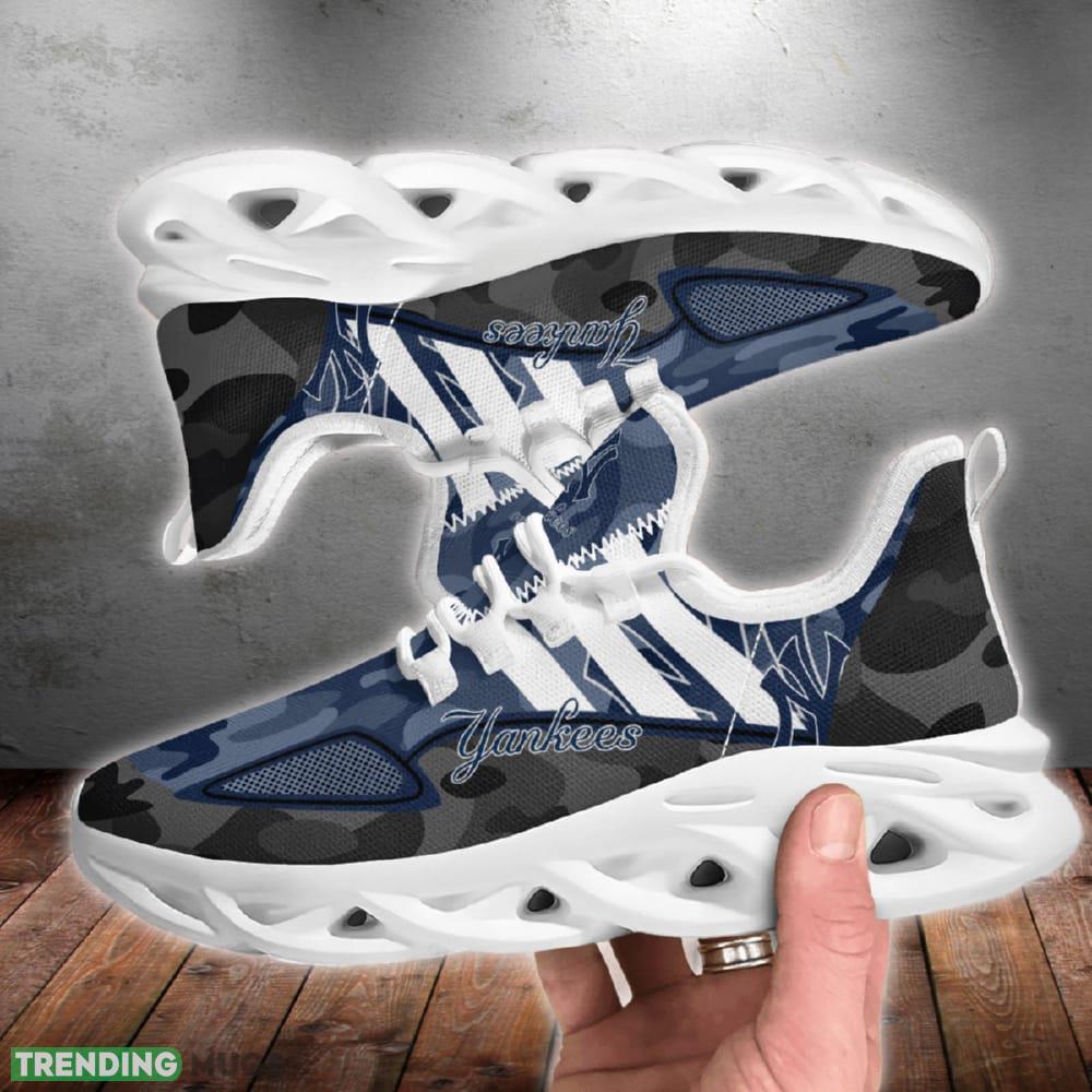 This New York Yankees Military Camouflage Mark Chunky Shoes New Max Soul Sneakers Men Gift is a breathable, lightweight, and comfortable casual outdoor shoe that has a unique design. It is made of a mesh fabric which makes it sweat absorbent and breathable, while the rubber bottom ensures traction, comfort, and durability. It is available in two colors: black or white sole. There are two styles of shoelace holes so you can choose your preference.