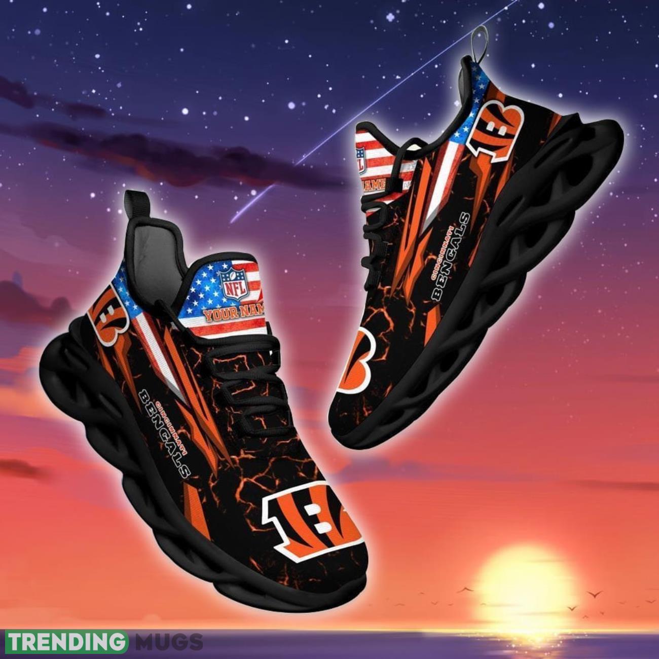 Show your true colors and support your favorite NFL team with our NFL Cincinnati Bengals Logo And Flag Custom Name Max Soul Shoes! These unique shoes are the perfect gift for any Bengals fan in your life. Personalize them with your own name or the name of your loved one for a special touch. Whether you’re heading to the game or just want to show off your team pride, these shoes are sure to turn heads. Don’t miss out on the opportunity to rock your Bengals spirit in style with these one-of-a-kind custom shoes. Get yours today and step out in ultimate fan fashion!