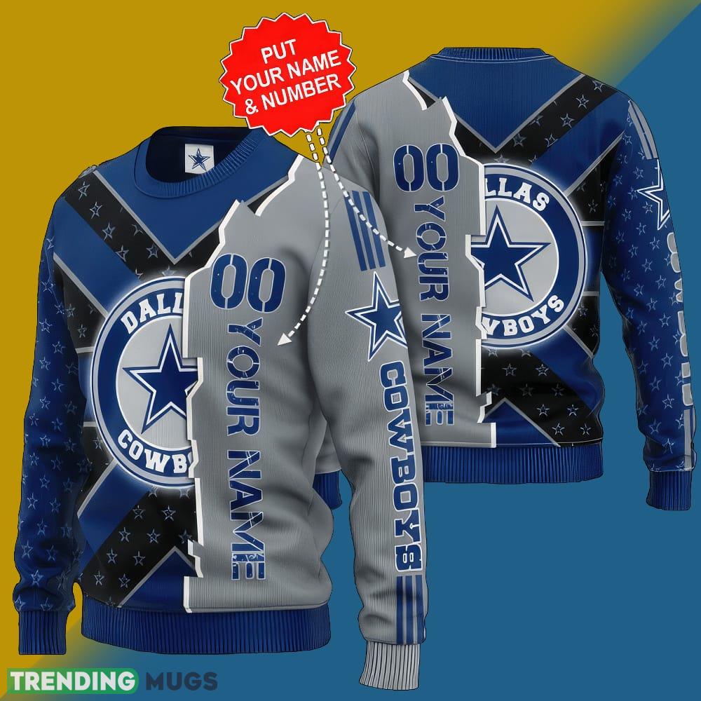 NFL Dallas Cowboys Grey Blue Black Star Christmas Neckline 3D Ugly Sweater Custom Number And Name Informations: