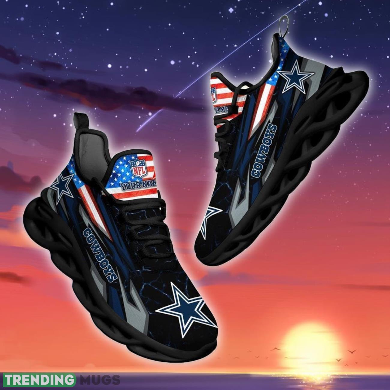 Show your love for the NFL Dallas Cowboys with these custom name Max Soul shoes! Featuring the iconic Cowboys logo and flag, these shoes are the perfect gift for any fan. Personalize them with your name or the name of your favorite player for a unique touch. Step out in style and support your team with these one-of-a-kind shoes. Get yours today and show off your Cowboys pride wherever you go!