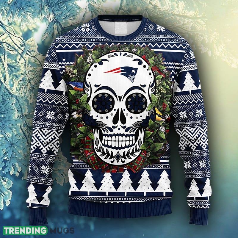 Crafted with meticulous attention to detail, this sweater features a bold and vibrant New England Patriots design. The iconic team logo takes center stage, surrounded by intricately woven flowers and skulls, adding a touch of edgy flair to the festive ensemble. The combination of contrasting colors creates an engaging visual appeal that is sure to turn heads at any holiday gathering.