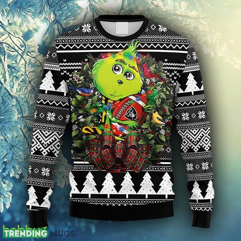 Crafted with utmost attention to detail, this sweater features the iconic Oakland Raiders logo and the mischievous Grinch, creating a delightful fusion of team pride and Christmas whimsy. Whether you’re cheering from the stands or cozying up by the fireplace, this sweater will keep you warm and stylish throughout the festive season.