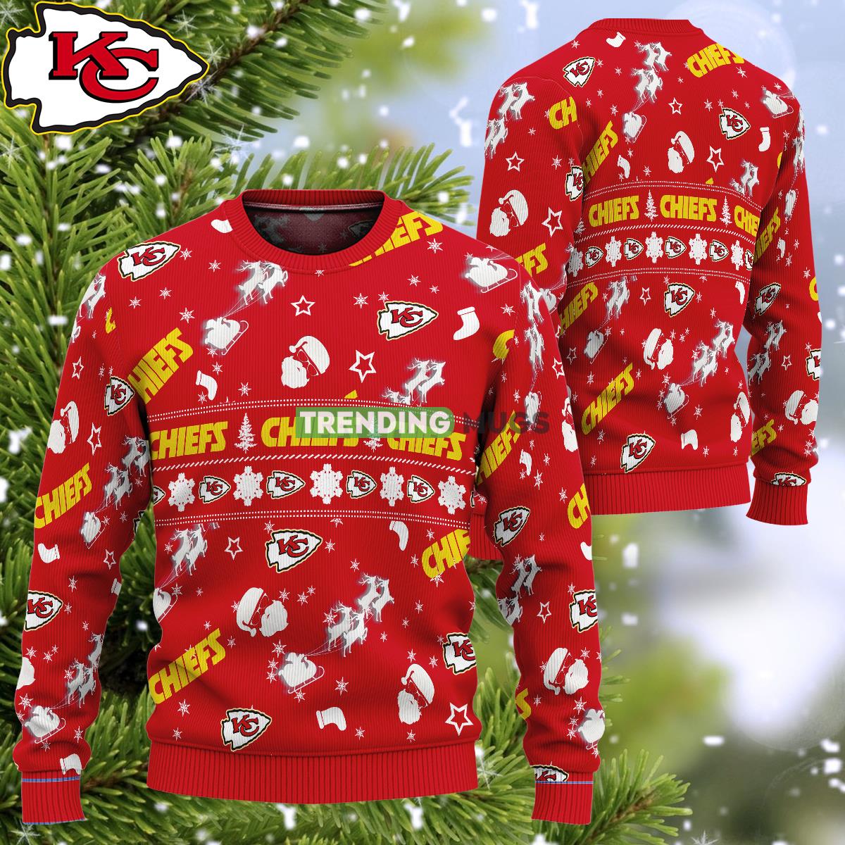 Crafted with meticulous attention to detail, this sweater features a playful design that combines the beloved Santa Claus and his trusty reindeer with the iconic Kansas City Chiefs logo. The vibrant colors and intricate stitching make this sweater a true standout, ensuring you’ll turn heads at any holiday gathering or game day event.
