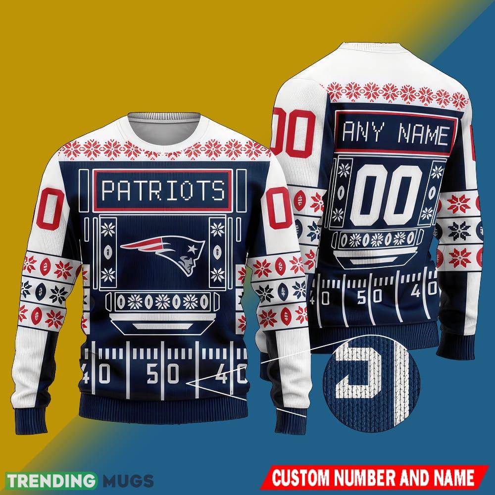 Featuring an eye-catching all-over print design that showcases the iconic New England Patriots logo and vibrant Christmas elements, this sweater is a must-have for any true fan. The custom number and name add a personal touch, making it a unique and special piece to wear during the holiday season.