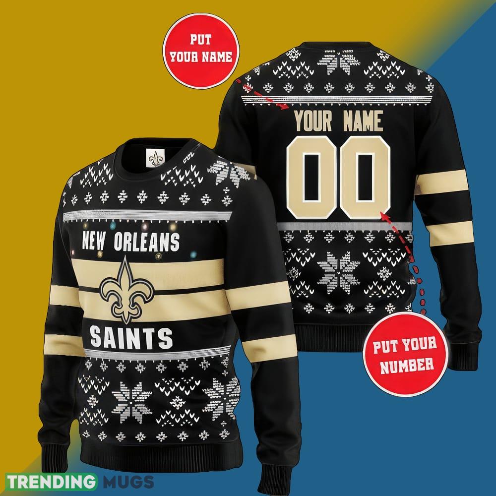 Perfect for holiday parties, family gatherings, or even game nights, the NFL New Orleans Saints Christmas Textile All Over Print Knitted Sweater Custom Number And Name is a must-have for any Saints supporter. Spread the holiday spirit while proudly displaying your team allegiance.