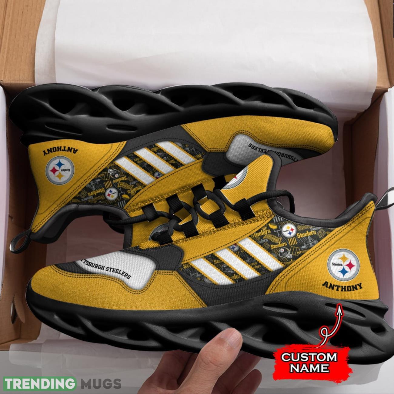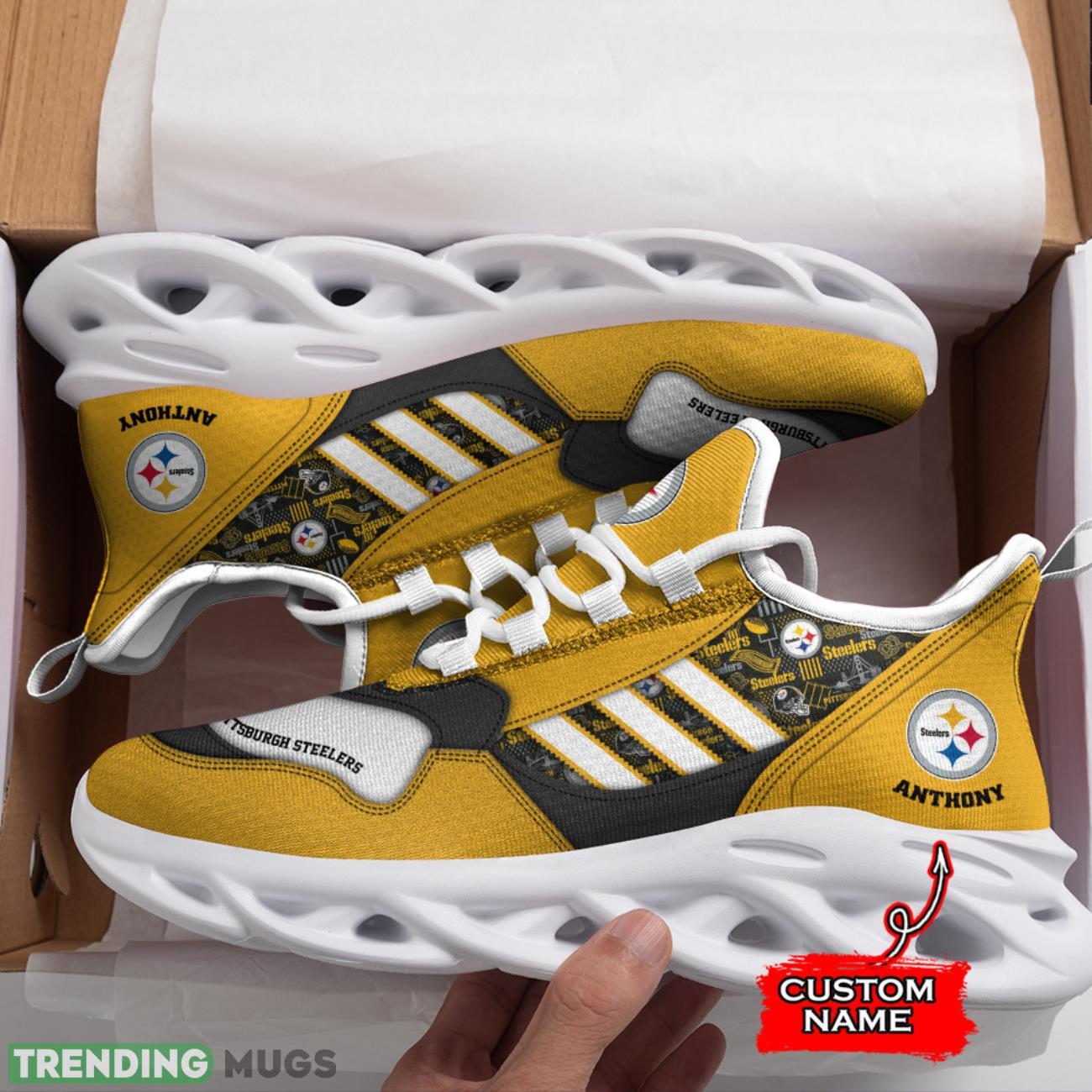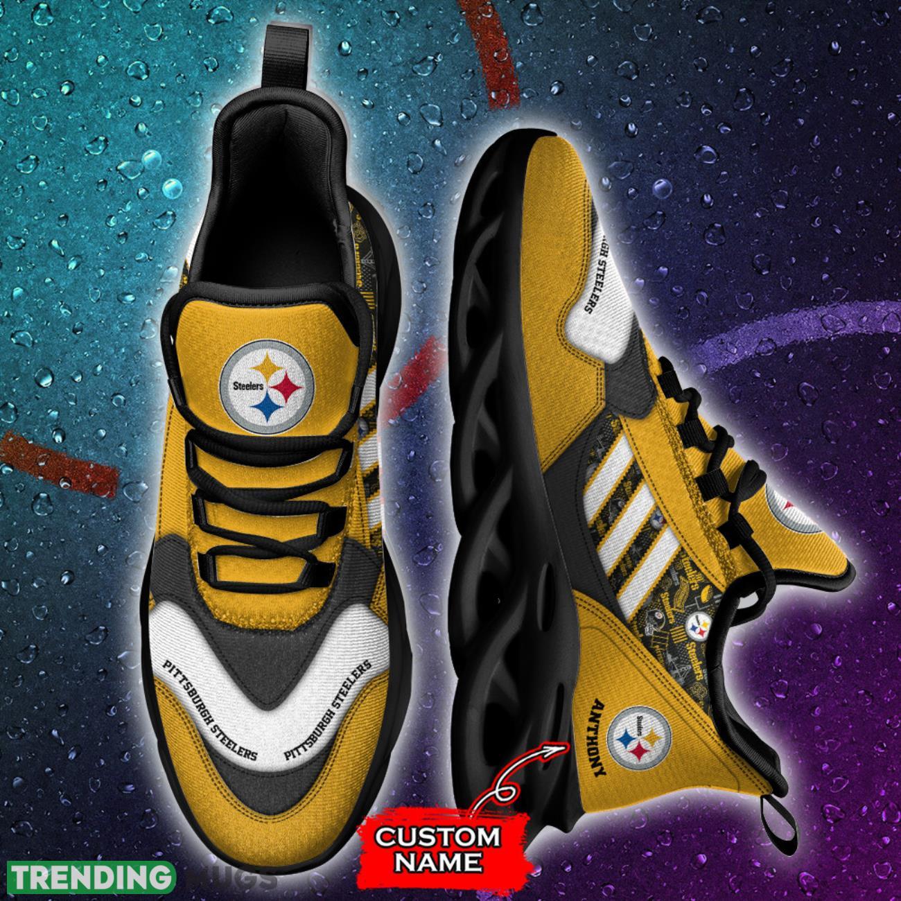 Elevate your game day style with these NFL Pittsburgh Steelers Max Soul Shoes! Perfect for any die-hard Steelers fan, these running sneakers are not only stylish but also customizable with your own name. Show off your team pride on and off the field with these unique and eye-catching shoes. Whether you’re hitting the gym or cheering on your favorite team, these sneakers are the perfect gift idea for any Steelers fan in your life. Order now and step up your game day look!