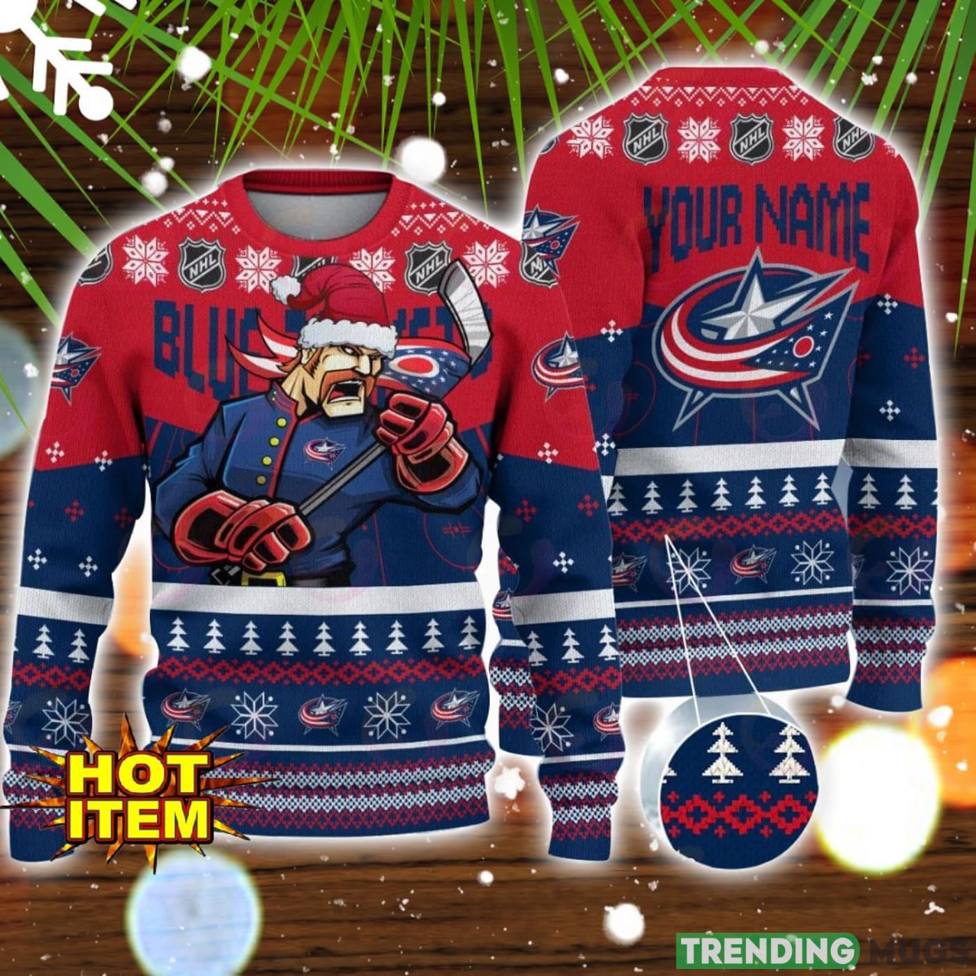 NHL Columbus Blue Jackets Angry Mascot Design Ugly Christmas Sweater Christmas Gift For Sport Fans Custom Name Product Photo 1
