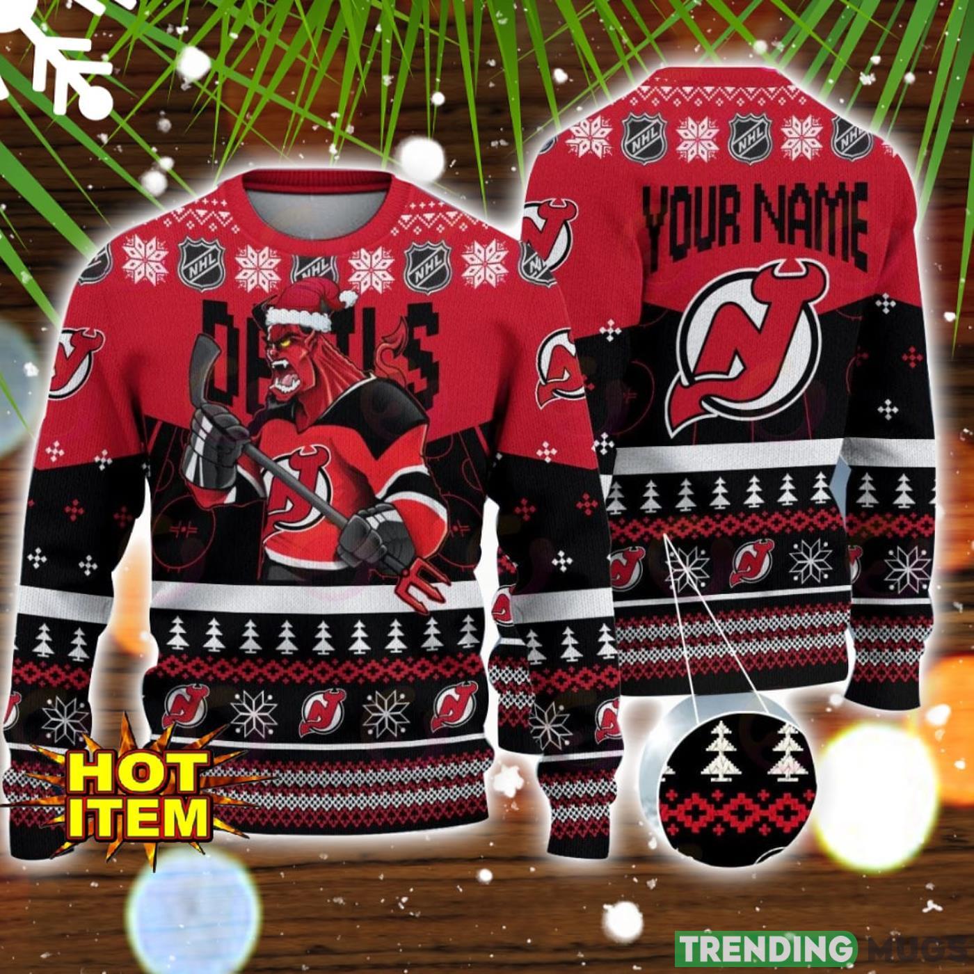 Crafted with exceptional attention to detail, this custom name sweater showcases the iconic Angry Mascot design of the New Jersey Devils, making it a must-have for any die-hard fan. The bold colors and intricate patterns will make you the star of any holiday gathering or game night.