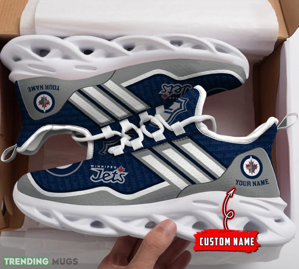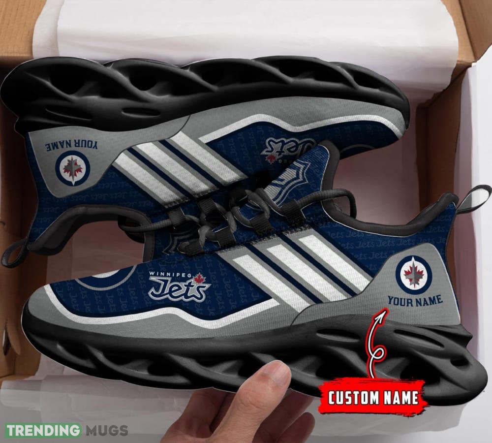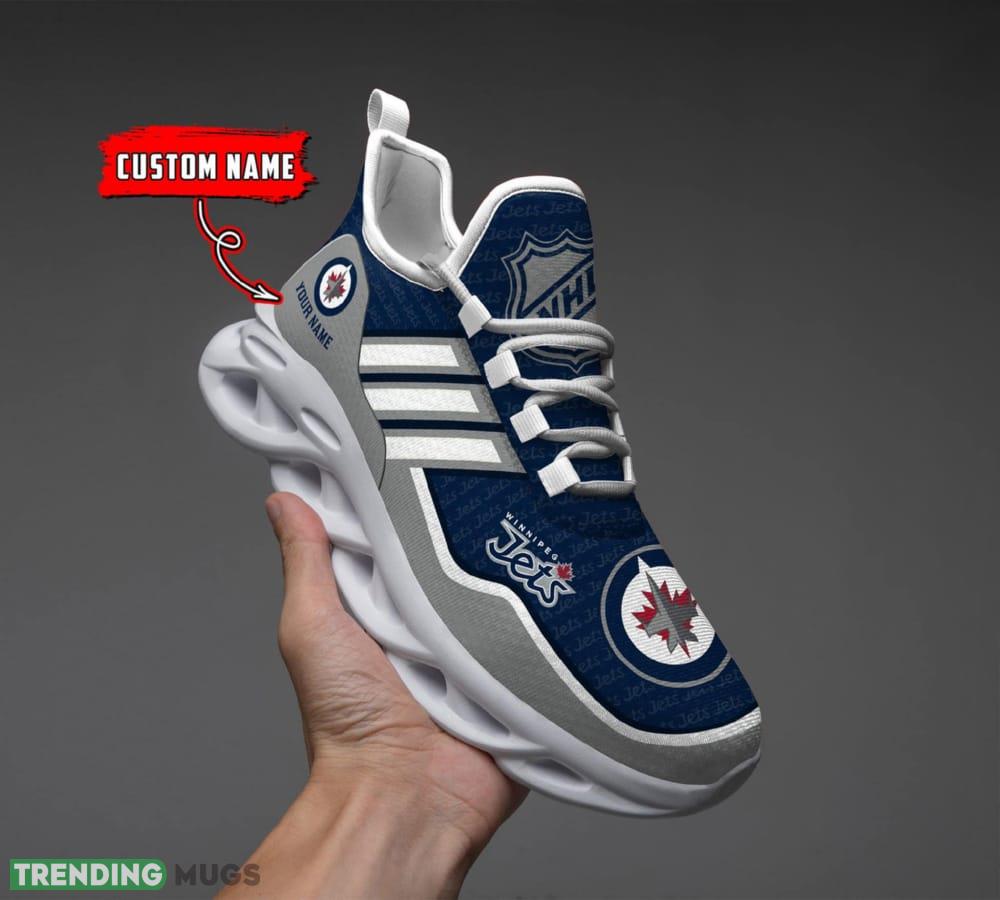 This NHL Winnipeg Jets Custom Name Max Soul Shoes Full Print For Men Women Sports Sneakers is a breathable, lightweight, and comfortable casual outdoor shoe that has a unique design. It is made of a mesh fabric which makes it sweat absorbent and breathable, while the rubber bottom ensures traction, comfort, and durability. It is available in two colors: black or white sole. There are two styles of shoelace holes so you can choose your preference.