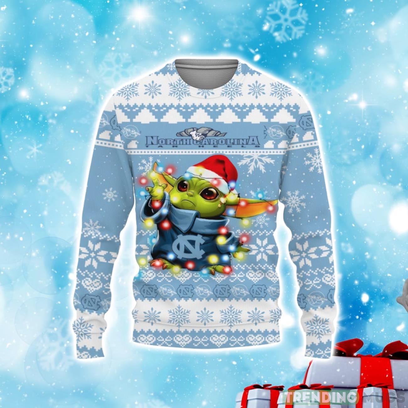 Spread the holiday cheer and show off your team loyalty with our North Carolina Tar Heels Baby Yoda Star Wars Sports Football American Ugly Christmas Sweater. Order yours today and make a unique fashion statement this holiday season!