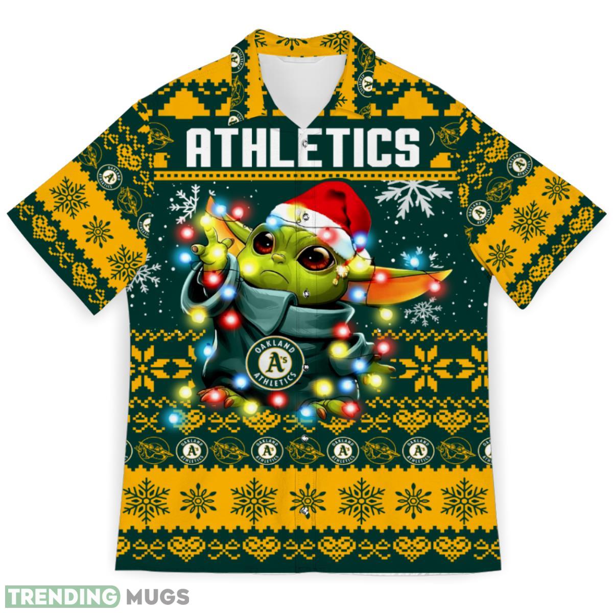 Get ready to show off your love for Star Wars, the Oakland Athletics, and the holiday spirit with our Oakland Athletics Baby Yoda Star Wars Sports Football Ugly Christmas Sweater Pattern 3D Hawaiian Shirt! This unique and eye-catching Christmas gift is the perfect addition to your festive wardrobe.
