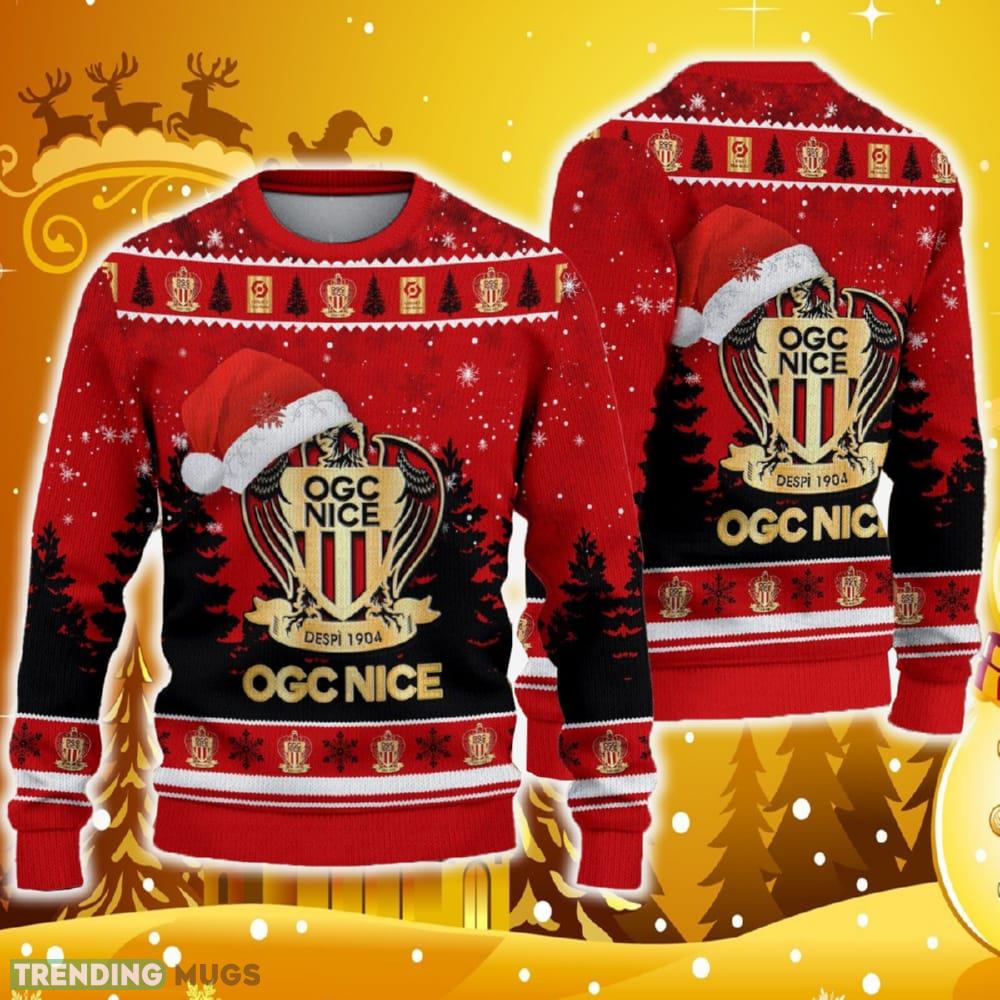 Get ready to spread some holiday cheer with the OGC Nice Ugly Christmas Sweater Santa Hat Logo Tree Gift! Whether you’re attending a festive gathering or just want to show off your love for OGC Nice during the most wonderful time of the year, this sweater is the perfect choice.