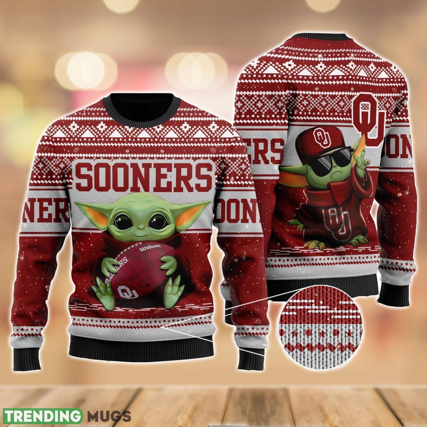 Featuring an adorable Grogu Baby Yoda hugging the iconic Oklahoma Sooners logo, this sweater combines your love for the team and the beloved Star Wars character. The all-over print design ensures that the festive spirit is carried throughout the entire sweater, making it truly eye-catching and unique.
