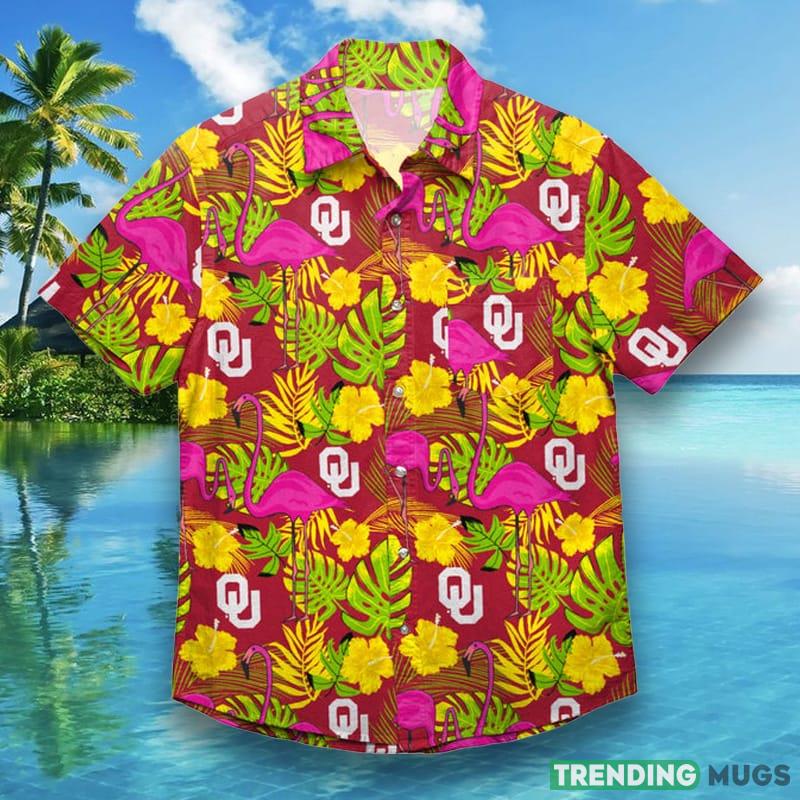 Featuring a bold red and white color scheme with the iconic Oklahoma Sooners logo prominently displayed on the chest, this shirt is sure to turn heads wherever you go. The Hawaiian-style design adds a touch of fun and flair to your wardrobe, making it the perfect choice for game day, tailgating parties, or any other occasion where you want to show off your team pride.