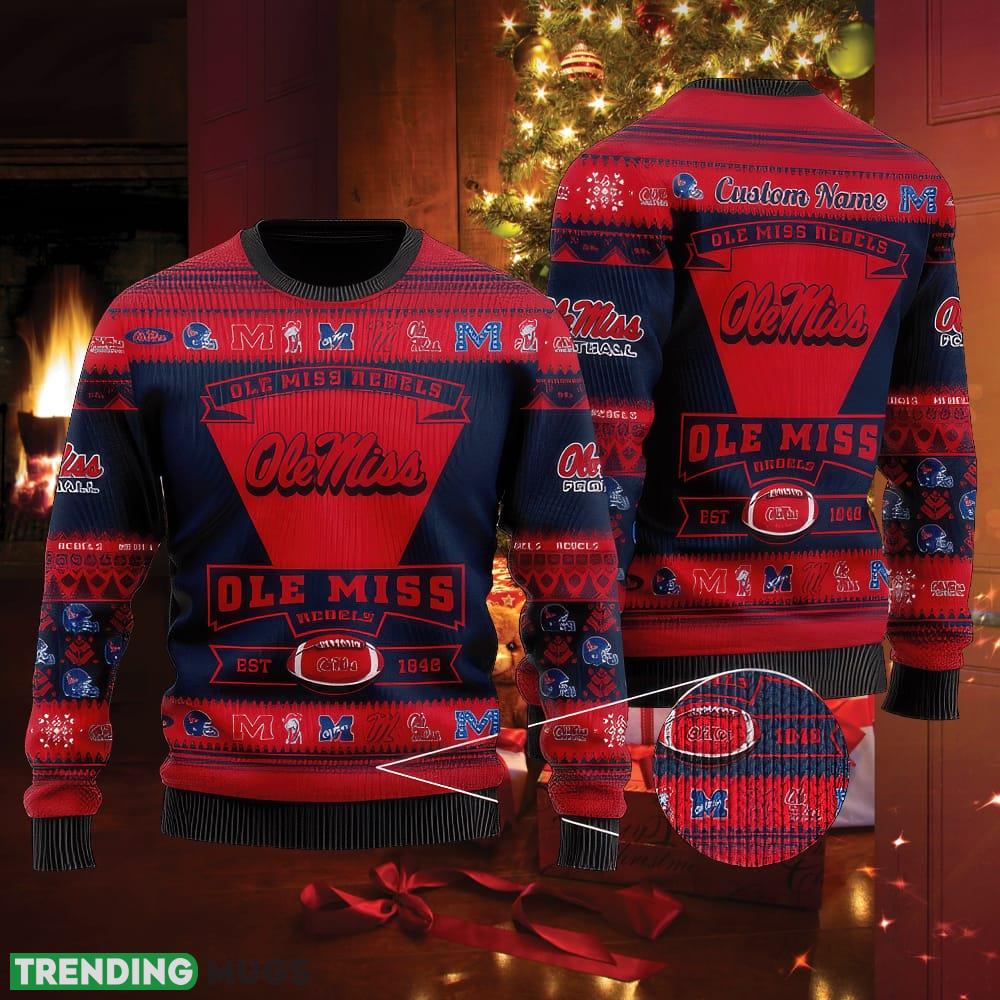 Ole Miss Rebels Football Team Logo Knitted Christmas 3D Sweater Season Custom Name Informations: