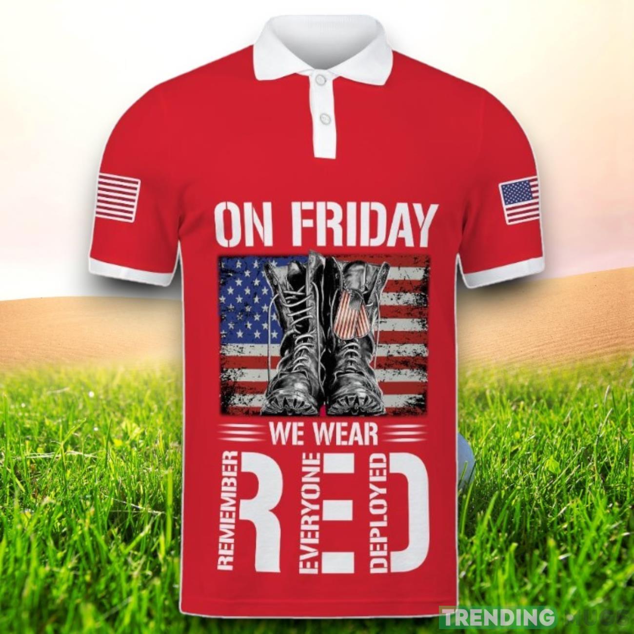 On Friday We Wear Red Remember Everyone Deployed Army Name Tag And Boots American Flag Polo Shirt Information:
