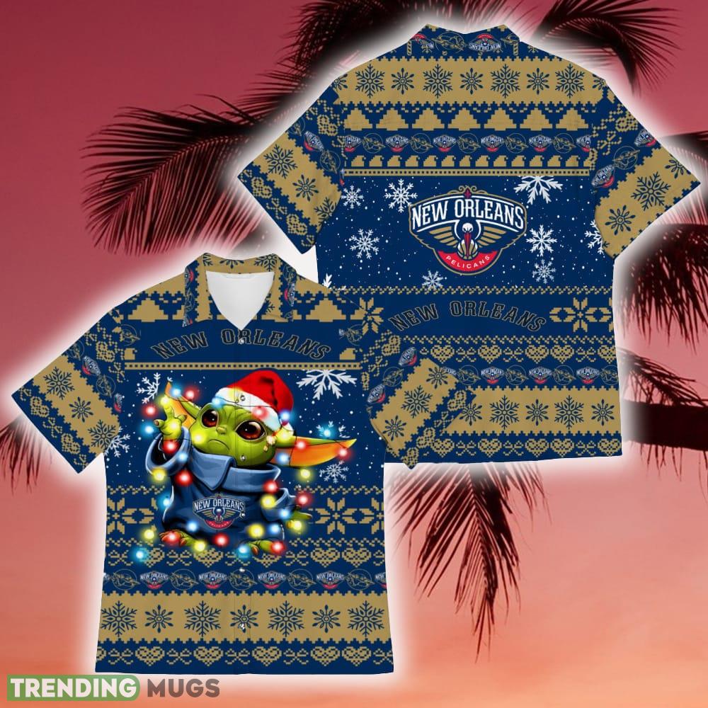 Made from high-quality materials, this Hawaiian shirt offers a comfortable fit that will keep you feeling cool and relaxed during the festive season. The eye-catching design features a delightful combination of Baby Yoda and Star Wars motifs, adorned with the distinctive colors of the New Orleans Pelicans. It effortlessly captures the spirit of the holidays, making it a must-have addition to your wardrobe.