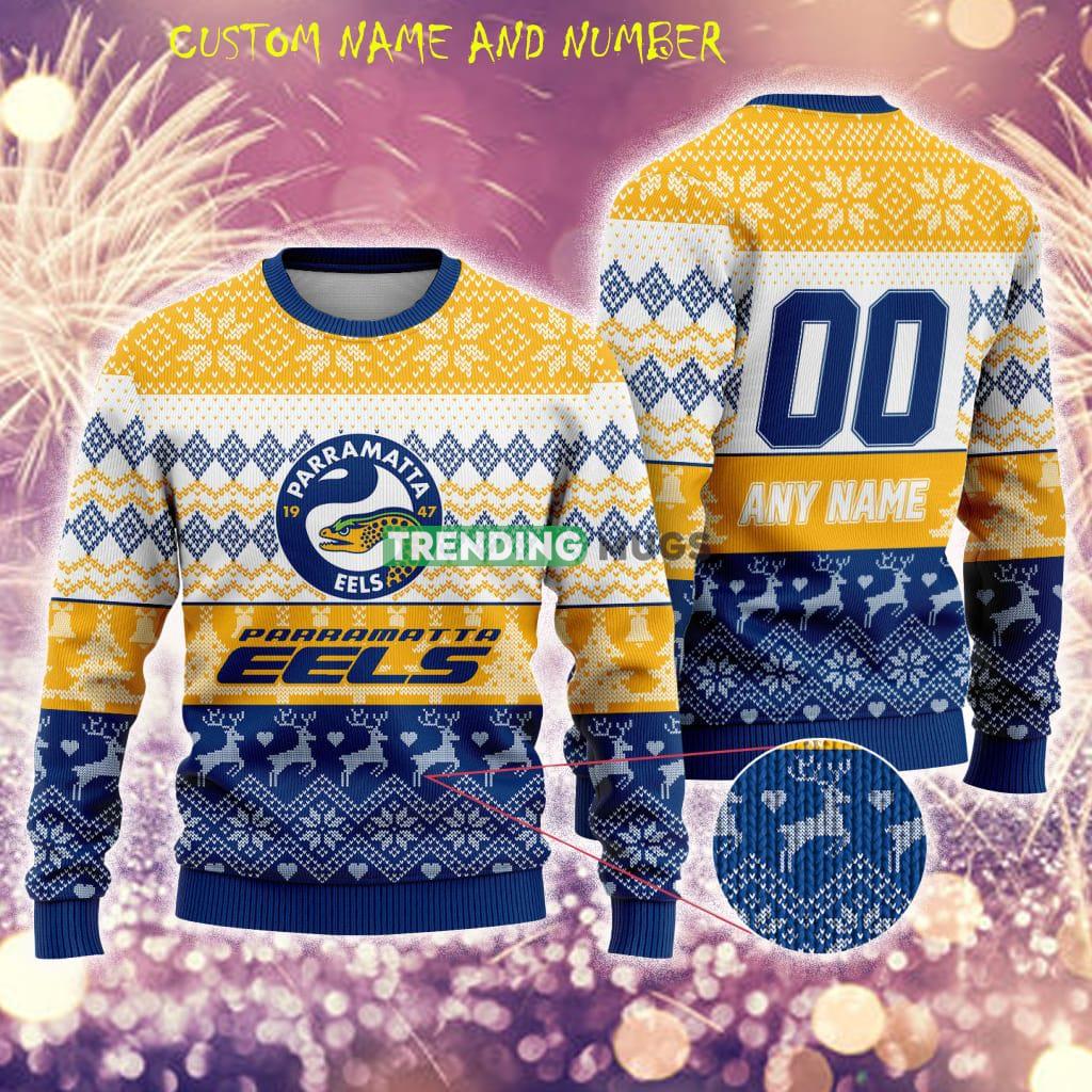 Parramatta Eels NRL Christmas Cute 3D Ugly Sweater Gift For Men And Women Custom Number And Name Informations: