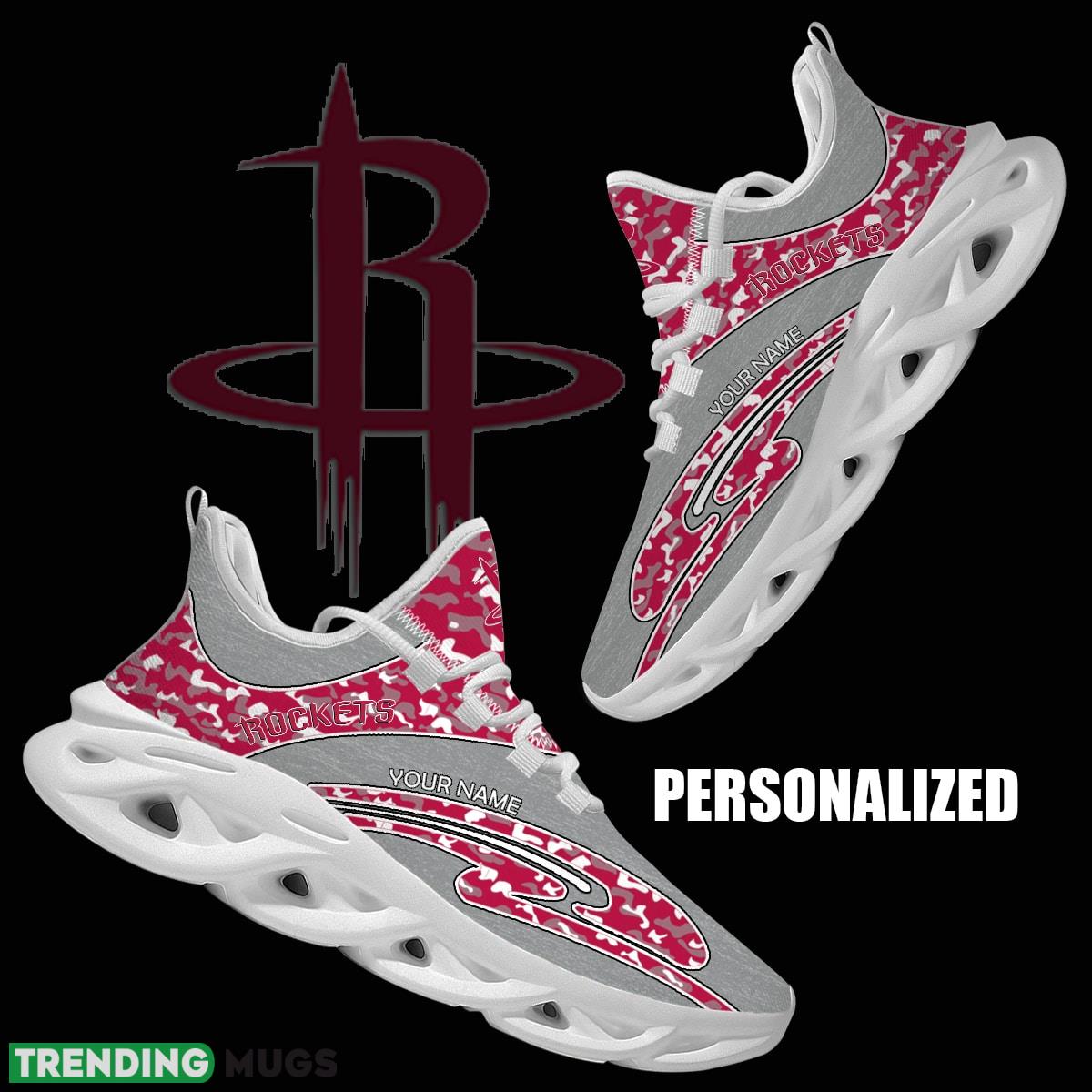 This Personalized Camo Design NBA Houston Rockets Max Soul Shoes Creative Running Sneaker is a breathable, lightweight, and comfortable casual outdoor shoe that has a unique design. It is made of a mesh fabric which makes it sweat absorbent and breathable, while the rubber bottom ensures traction, comfort, and durability. It is available in two colors: black or white sole. There are two styles of shoelace holes so you can choose your preference.