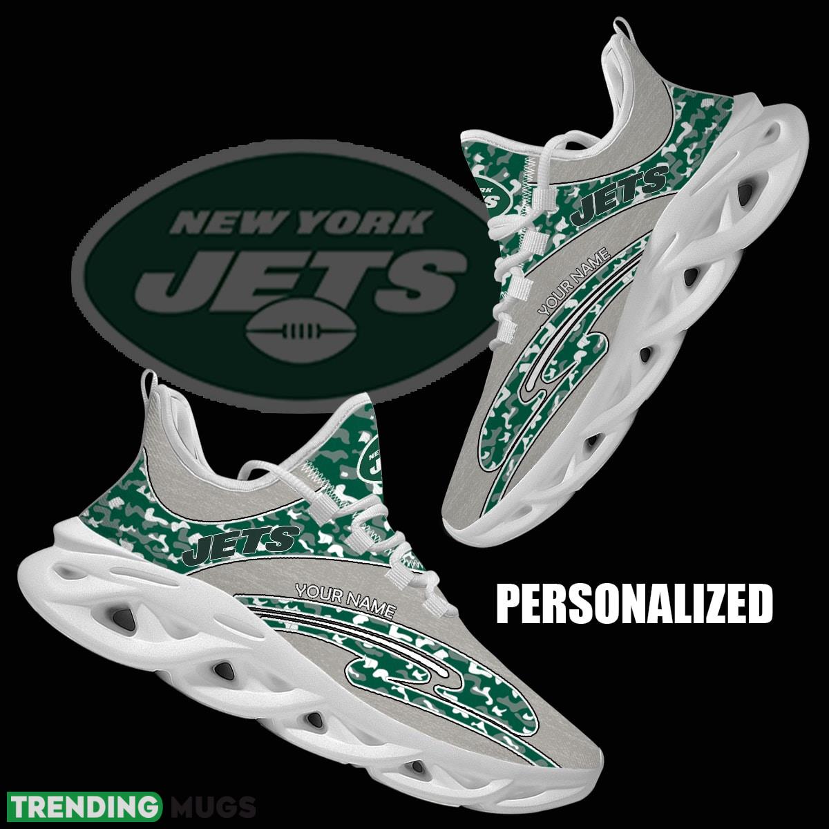 This Personalized Camo Design NFL New York Jets Max Soul Shoes Craftsmanship Chunky Sneaker is a breathable, lightweight, and comfortable casual outdoor shoe that has a unique design. It is made of a mesh fabric which makes it sweat absorbent and breathable, while the rubber bottom ensures traction, comfort, and durability. It is available in two colors: black or white sole. There are two styles of shoelace holes so you can choose your preference.