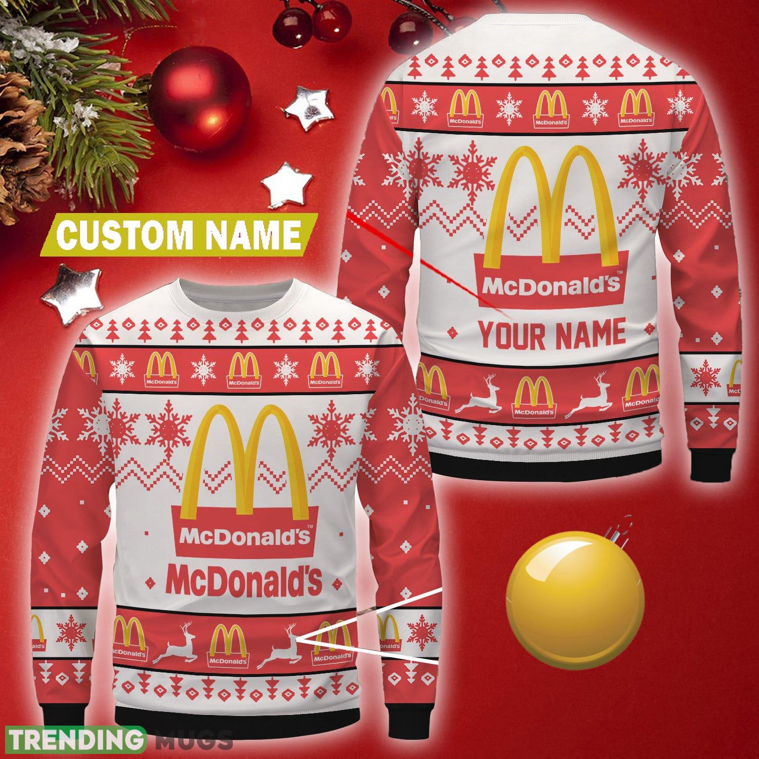 Featuring the iconic McDonald’s uniform brand logo along with delicate snowflake patterns, this sweater effortlessly combines the joy of Christmas with a touch of nostalgia. The personalized design adds a special touch, making it a unique and thoughtful gift for yourself or a McDonald’s enthusiast in your life.